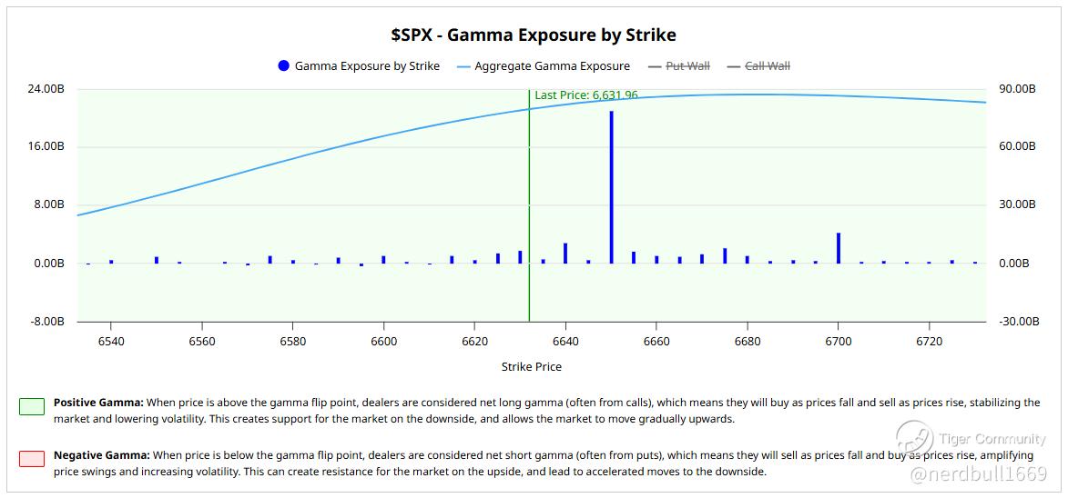 SPX (index) OI / gamma also concentrates at the equivalent 6,600 level (SPX ~10× SPY strikes), and commentary suggests that gamma there has been a market-making focal point.