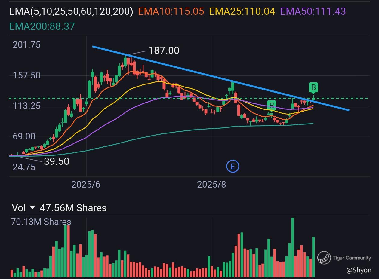 The second add came after watching the stock carefully since mid-June. CoreWeave had been stuck under a persistent downtrend line, with each rally attempt failing to push through resistance. Yesterday, that changed. The stock not only broke above the downtrend line, but it did so with a significant surge in volume—almost double the daily average.
