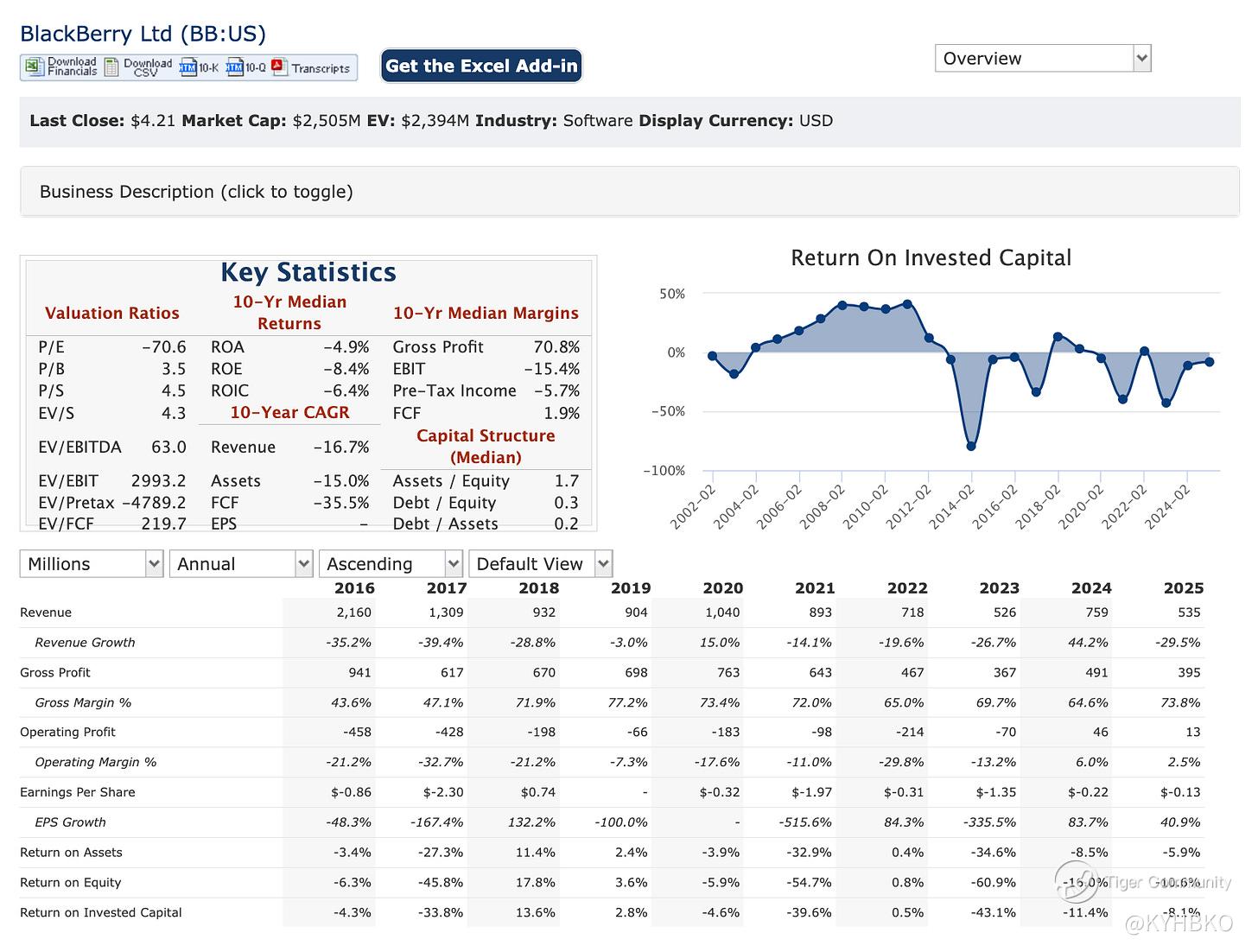 BlackBerry has demonstrated a significant turnaround in its financial performance. The company's revenue has decreased from $2.1 billion in 2016 to $535 million in 2025. However, it has successfully transitioned from a substantial operating loss of $458 million in 2016 to a positive operating profit of $13 million in 2025, indicating improved operational efficiency and a successful shift in business strategy.