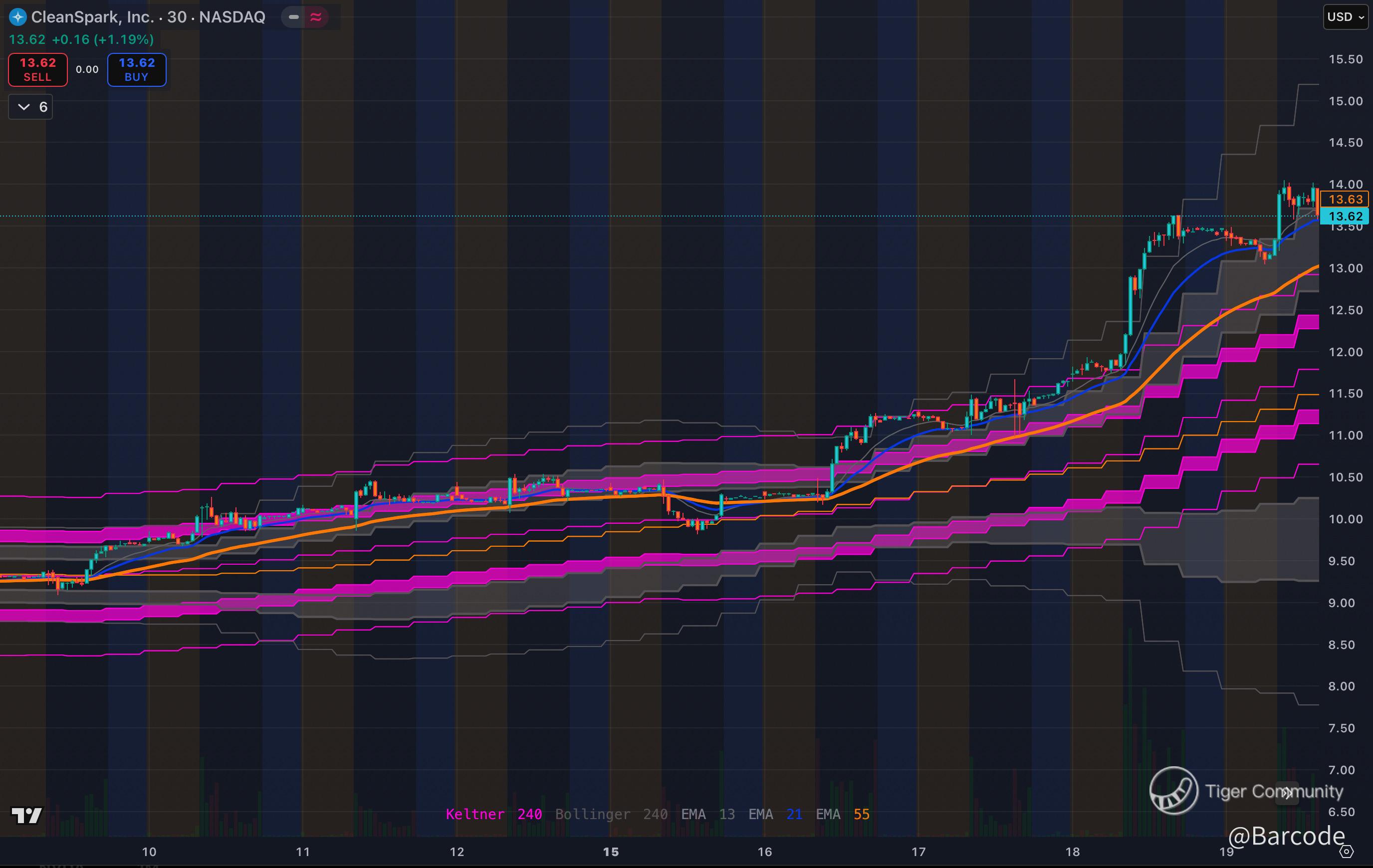 • $CLSK: 🟢 $11.00 | 🔴 $13.60–$14.00 | 🟠 $16.50 | RSI high-60s, MACD strong upward slope