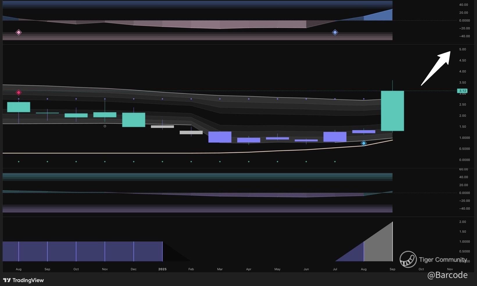 • $BITF: 🔴 $3.60 | 🟠 $4.00–$5.00 | RSI mid-60s, MACD turning bullish on monthly