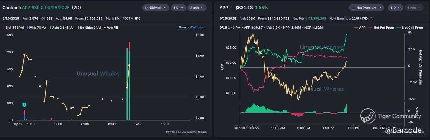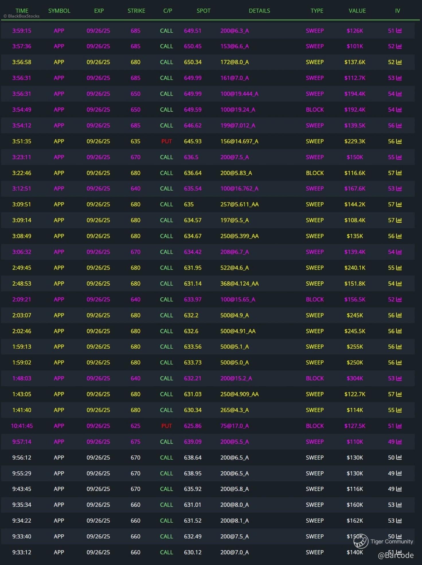 β’ $APP shows no signs of exhaustion. Options whales are betting on $680 by next week, with over $1.2M in premium swept. When that kind of flow hits, momentum is real.