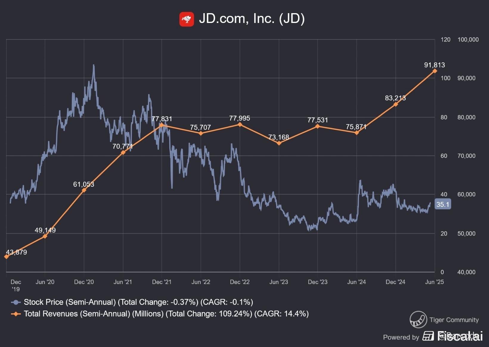JDβs revenues have climbed relentlessly for over a decade, rising from 43,879M in 2019 to 91,813M projected by mid-2025, compounding at 14.4% CAGR. Yet the stock price sits near $35, far below where growth justifies. This mismatch mirrors $PLTR, $HOOD, or $HIMS in their early days; strong growth, lagging valuation, then explosive rerates.