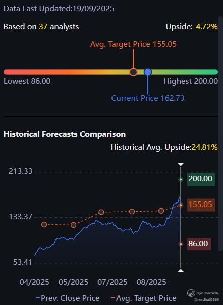 Based on 37 analysts from Tiger Brokers offering 12 month price targets for Micron in the last 3 months. The average price target is $155.05 with a high forecast of $200.00 and a low forecast of $86.00. The average price target represents a -4.72% change from the last price of $162.73.