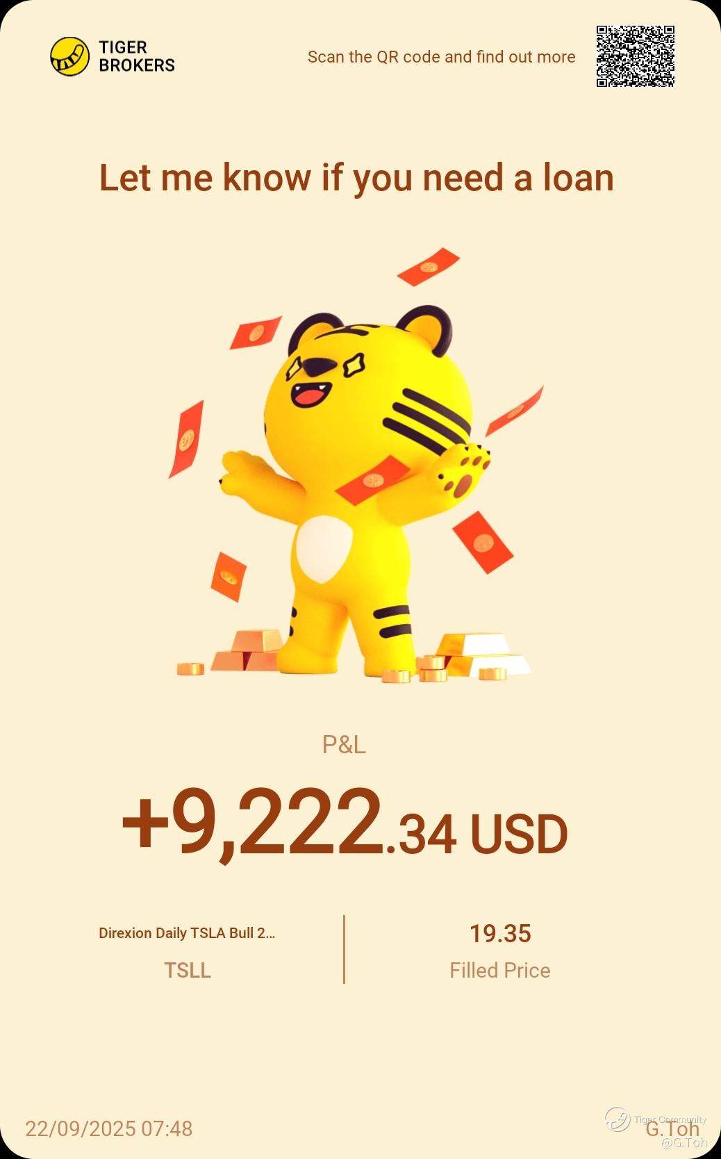 - Barcode·09-22TOP😳🤩🙌 That’s absolutely outstanding, @G.Toh ! 💰🔥 Locking in +9,222.34 USD on TSLL is a massive win and a testament to sharp execution. Taking profit at strength while planning to reload at support is exactly how to compound gains as Tesla pushes toward $438 and eyes that $455 stretch Love to see it!🚀📈1Report