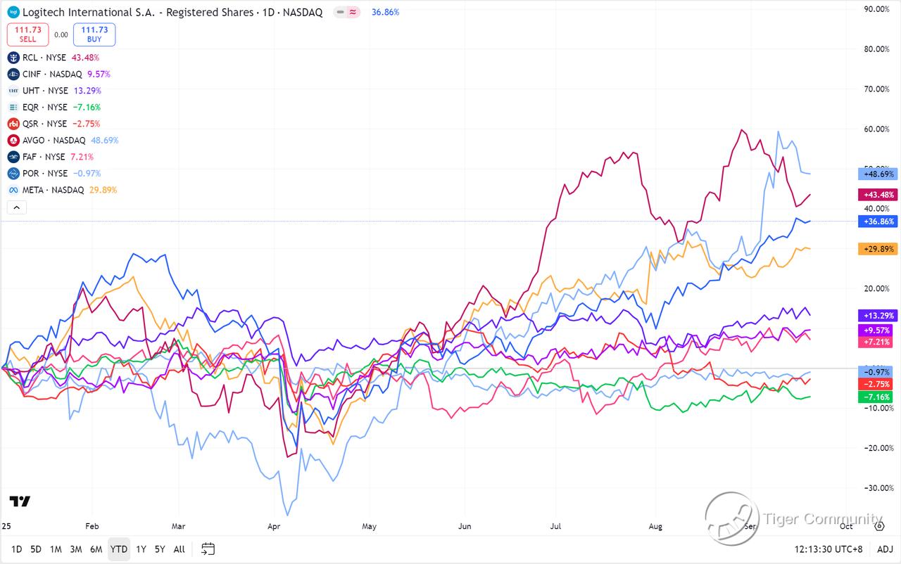 TradingView's data for 2025 shows that Logitech International S.A. $Logitech International SA(LOGI)$ , Royal Caribbean Cruises Ltd. $Royal Caribbean Cruises(RCL)$, Cincinnati Financial Corporation $Cincinnati(CINF)$, Universal Health Realty Income Trust $Universal Health Realty Income(UHT)$, Broadcom Inc. $Broadcom(AVGO)$ , First American Financial Corporation $First American(FAF)$ , and Meta Platforms, Inc. $Meta Platforms, Inc.(META)$, saw positive performance, whereas Equity Residential $Equity(EQR)$ , Restaurant Brands International Inc. $Restaurant(QSR)$ , and Portland General Electric Company $Portland General(POR)$ experienced declines.