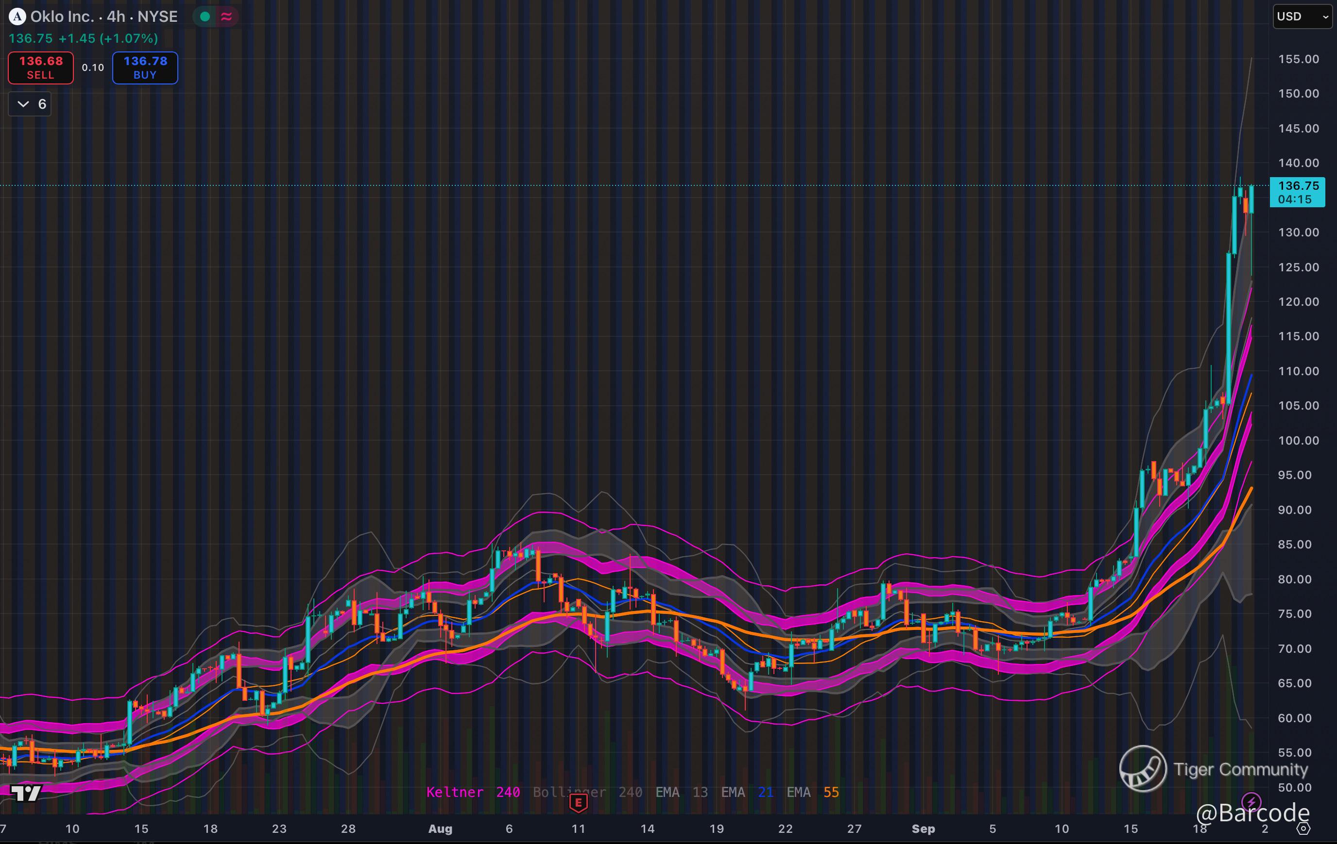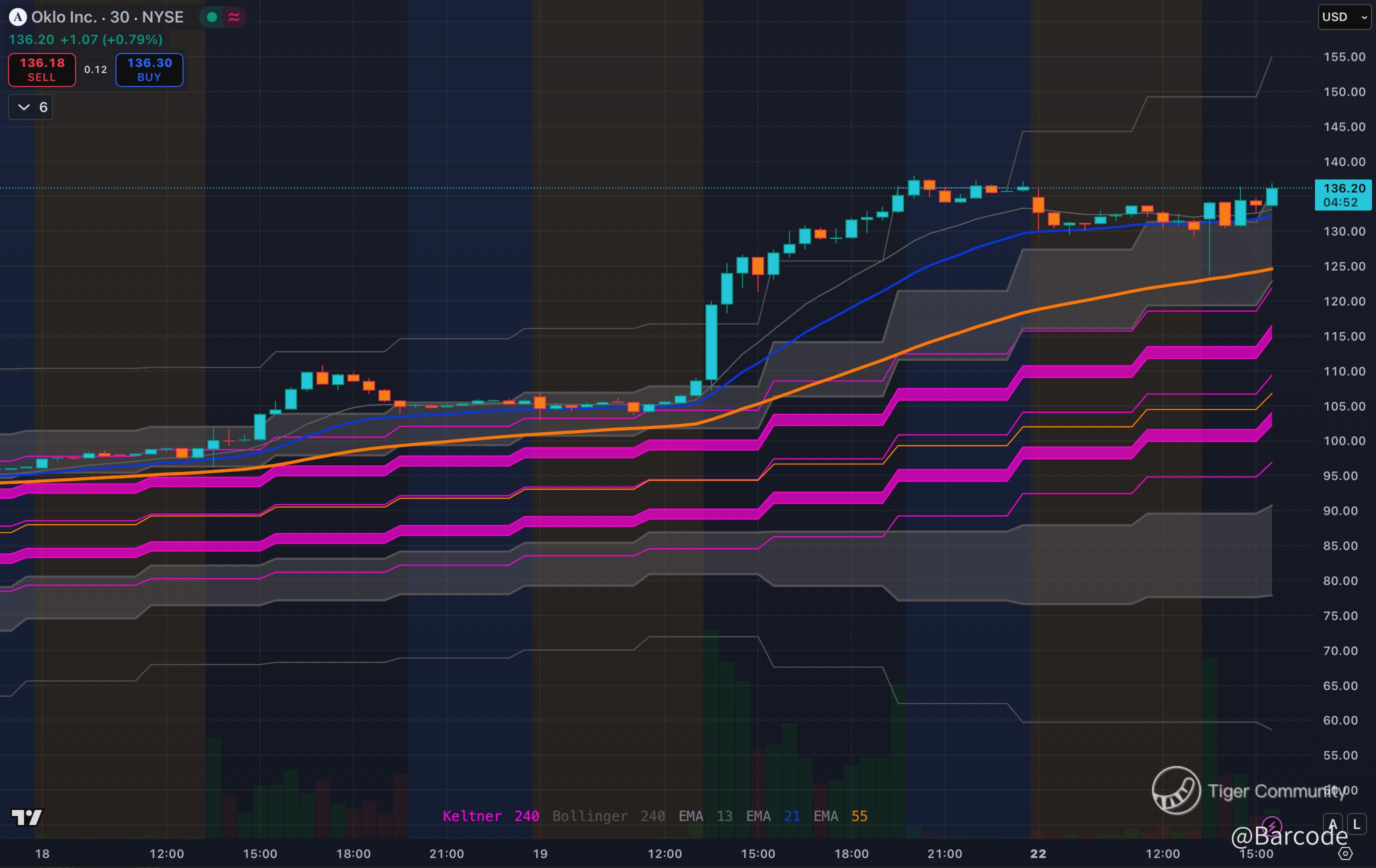 📈 The technical picture reinforces the narrative. The 30-minute chart shows relentless stair-stepping price action above layered Keltner and EMA support zones, while the 4H confirms a clean breakout through $120 with volume expansion. Both short-term and intermediate setups remain intact, with consolidation levels forming above $130.