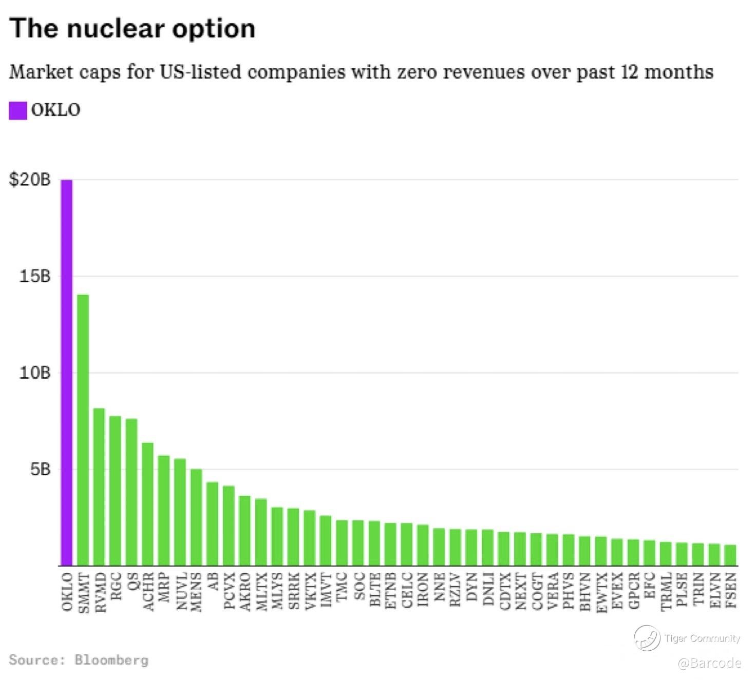 📊 Oklo has now become the single largest pre-revenue listed company in the United States. The Bloomberg chart shows it towering over peers with a ~$20B market cap despite generating zero revenue in the past 12 months. For context, that’s bigger than Dick’s Sporting Goods ($DKS), Dollar Tree ($DLTR), or Halliburton ($HAL).