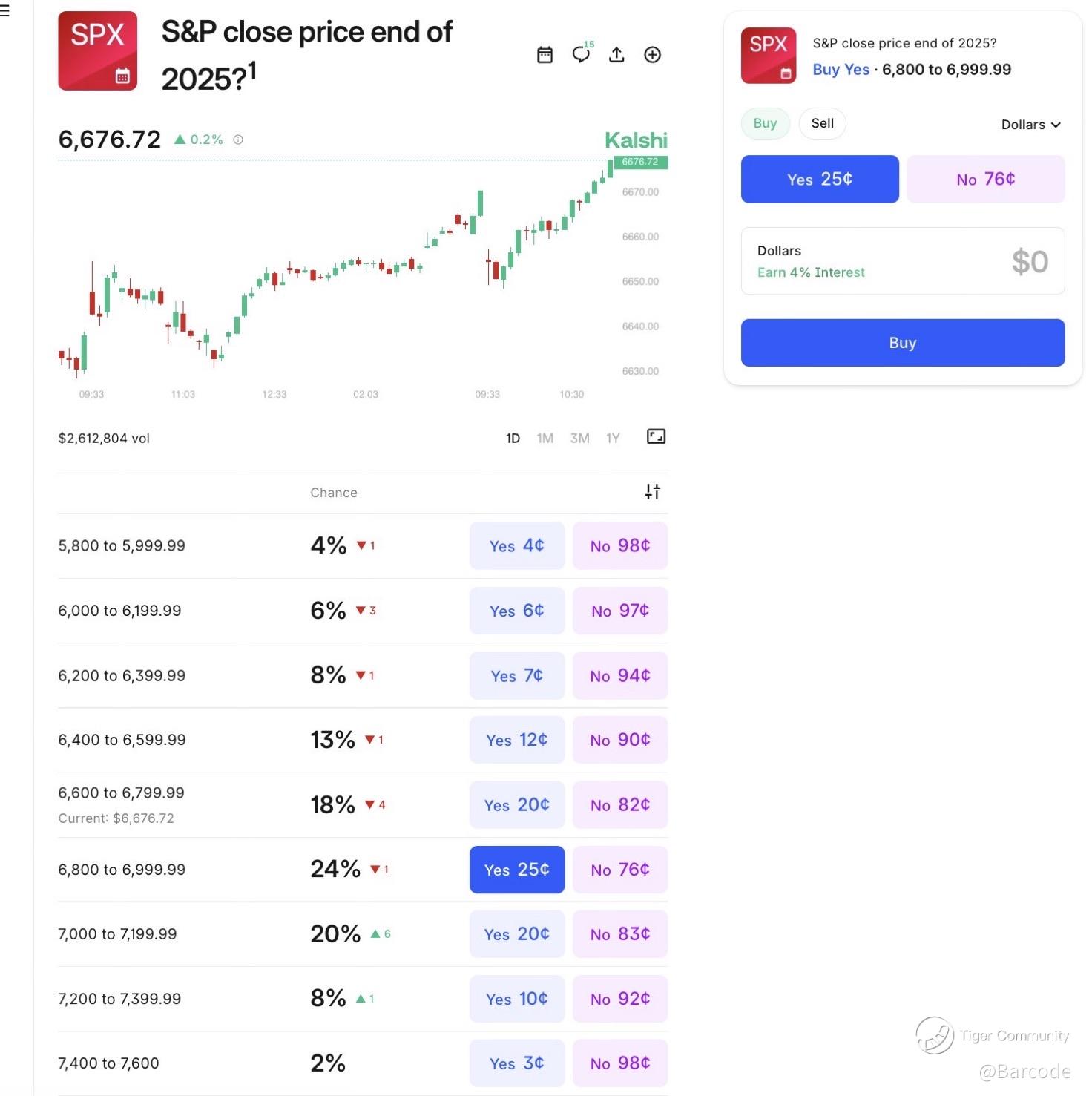 📊 On the macro side, Goldman Sachs just raised its S&P 500 year-end target to 6,800 (from 6,660). That’s in line with where Kalshi prediction markets show the highest probability band. The 6,800–6,999.99 range is currently priced as the most likely end-of-2025 close at 24%.
