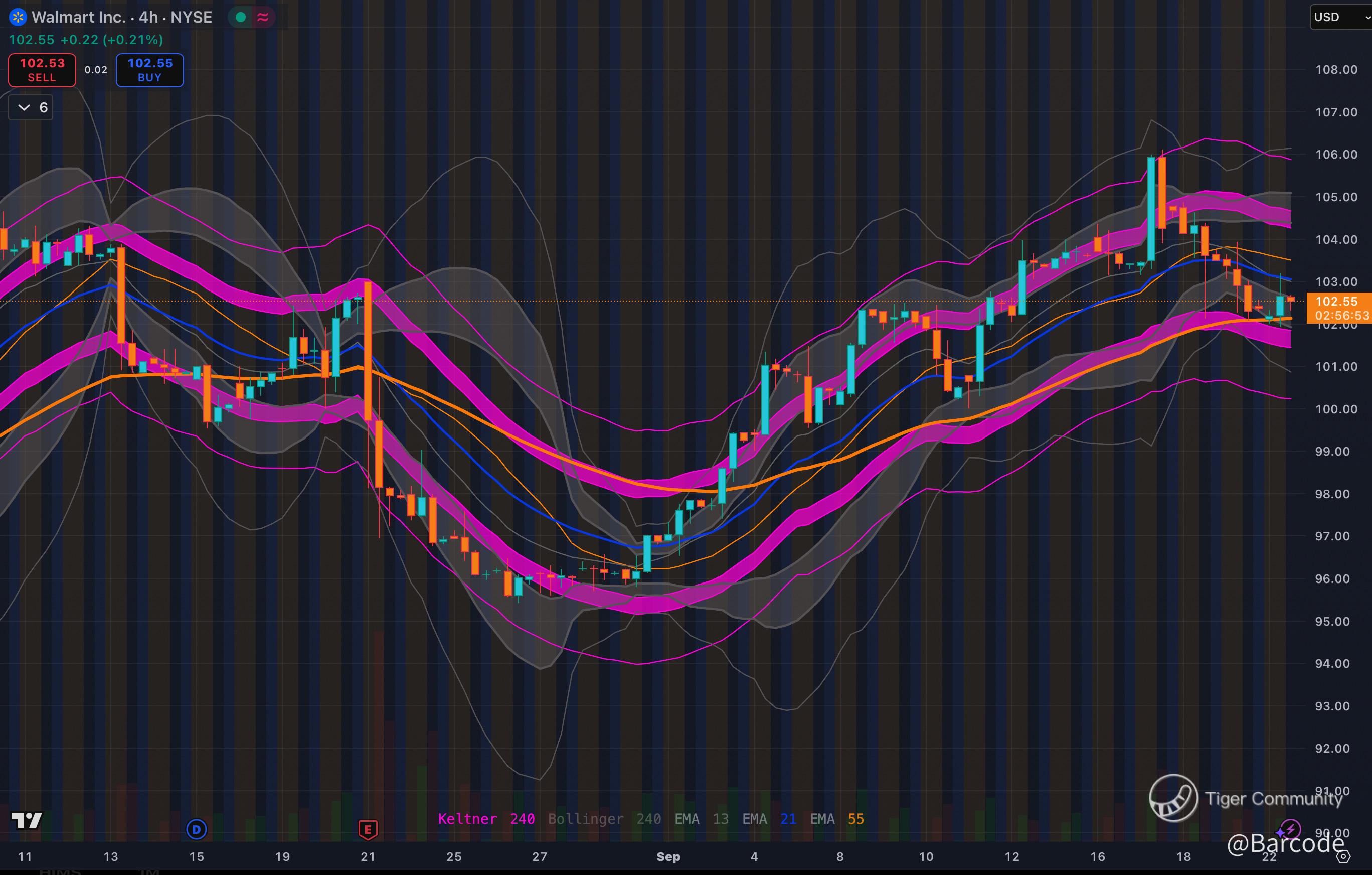 • $WMT 4H has been basing above $102, with buyers defending the EMA cluster. A push through $105 would re-ignite momentum after the recent pullback.