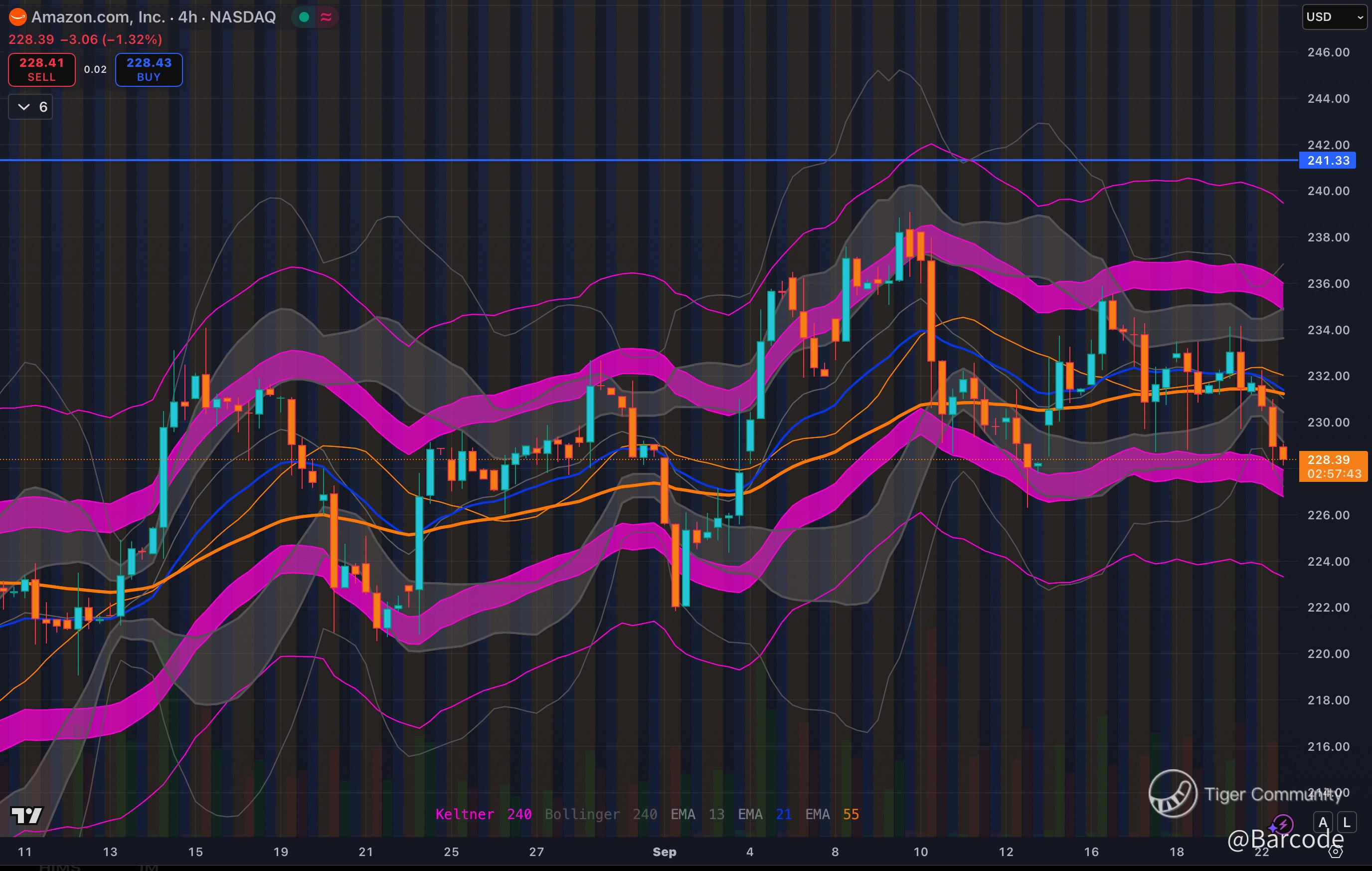 • $AMZN 4H is sliding toward $228 support with Keltner and Bollinger compression signaling volatility ahead. The last rejection near $241 suggests bears remain in control.