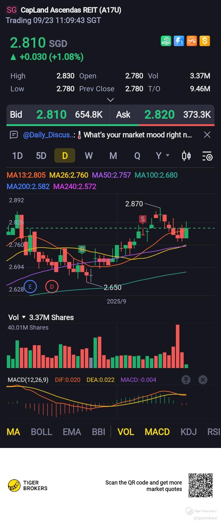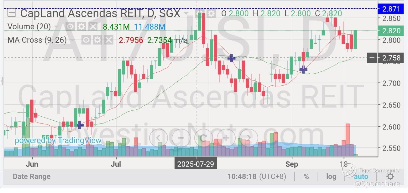 CapitaLand Ascendas REIT likely rise up to test 2.87 than 2.92 and above! Pls dyodd.