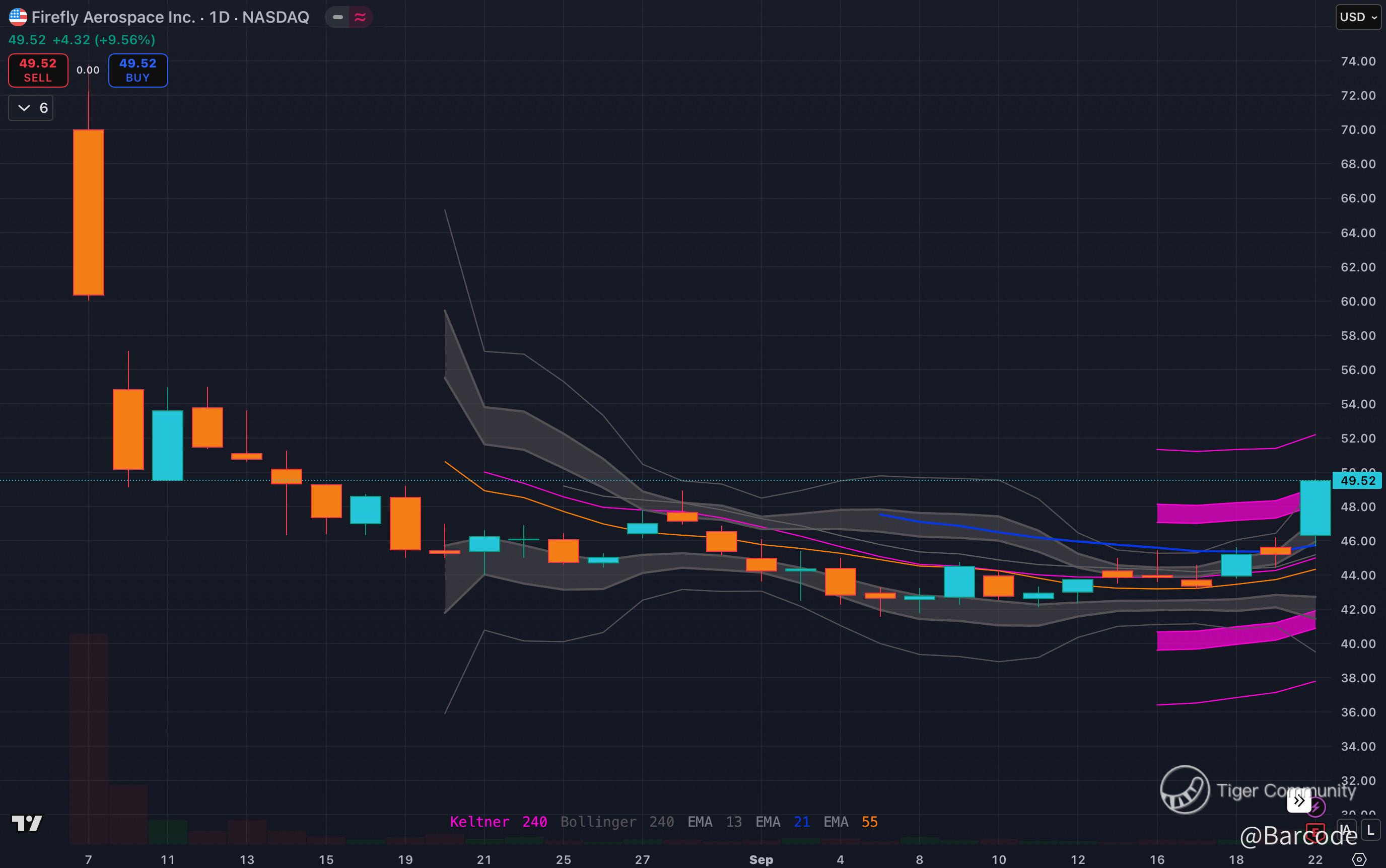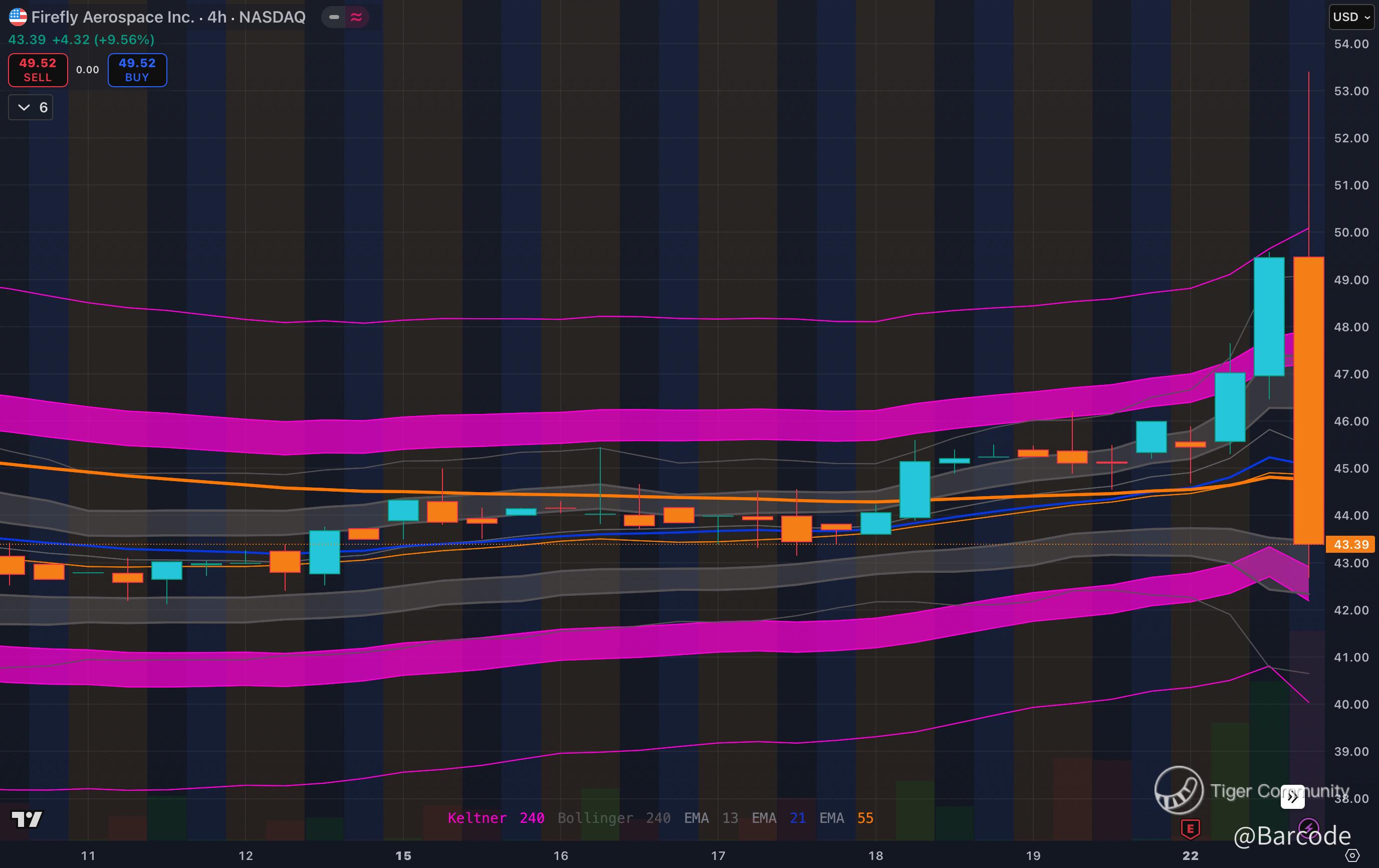 Daily chart shows $FLY breaking out +9.6% to $49.52 with expanding Keltner and Bollinger bands. The 4H confirms strong candles pressing upper bands with volume support. Holding $47 keeps momentum intact. Resistance sits at $, 53 and $58, with a stretch to $62 if follow-through persists. After-hours, shares dropped 12.4% to $43.36, highlighting the tension between long-term optionality and short-term lumpiness.