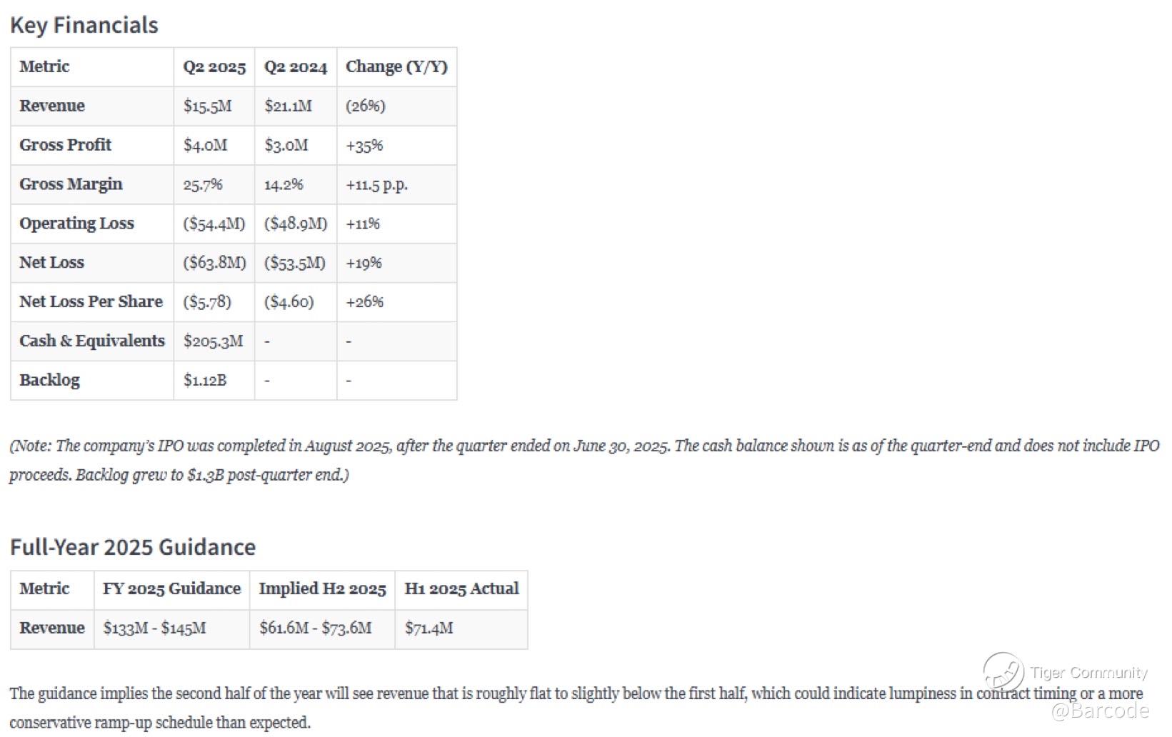Q2 revenue fell 26% YoY to $15.5M, missing analyst estimates of $16.8M. Net loss widened to $80.3M, or -$5.78 per share, versus a $58.7M loss (-$4.60) last year. Spacecraft Solutions revenue plunged 49% YoY after lapping a one-off mission, masking Alpha’s 113% YoY growth. H1 cash burn hit $84.6M. IPO runway absorbs it for now, but moderation is essential.