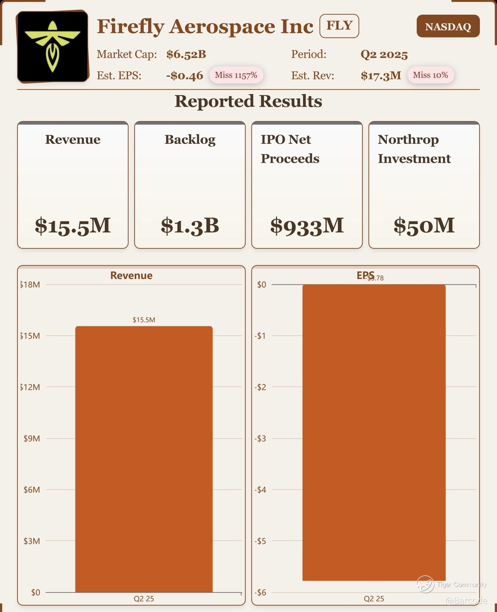 $Firefly Aerospace Inc.(FLY)$ $AST SpaceMobile, Inc.(ASTS)$ $Rocket Lab USA, Inc.(RKLB)$ I’m calling this quarter a defining inflection for Firefly Aerospace. The company has flipped from survival mode to scale mode in one stroke. With $933M in IPO proceeds and a $1.3B backlog anchored by NASA, Firefly now holds one of the most enviable financial cushions and contract pipelines in the new space sector. The equity story has shifted: this isn’t about whether Firefly can fund its roadmap, it’s about how fast it can execute on Alpha, Eclipse, and Blue Ghost to convert backlog into recurring revenue.