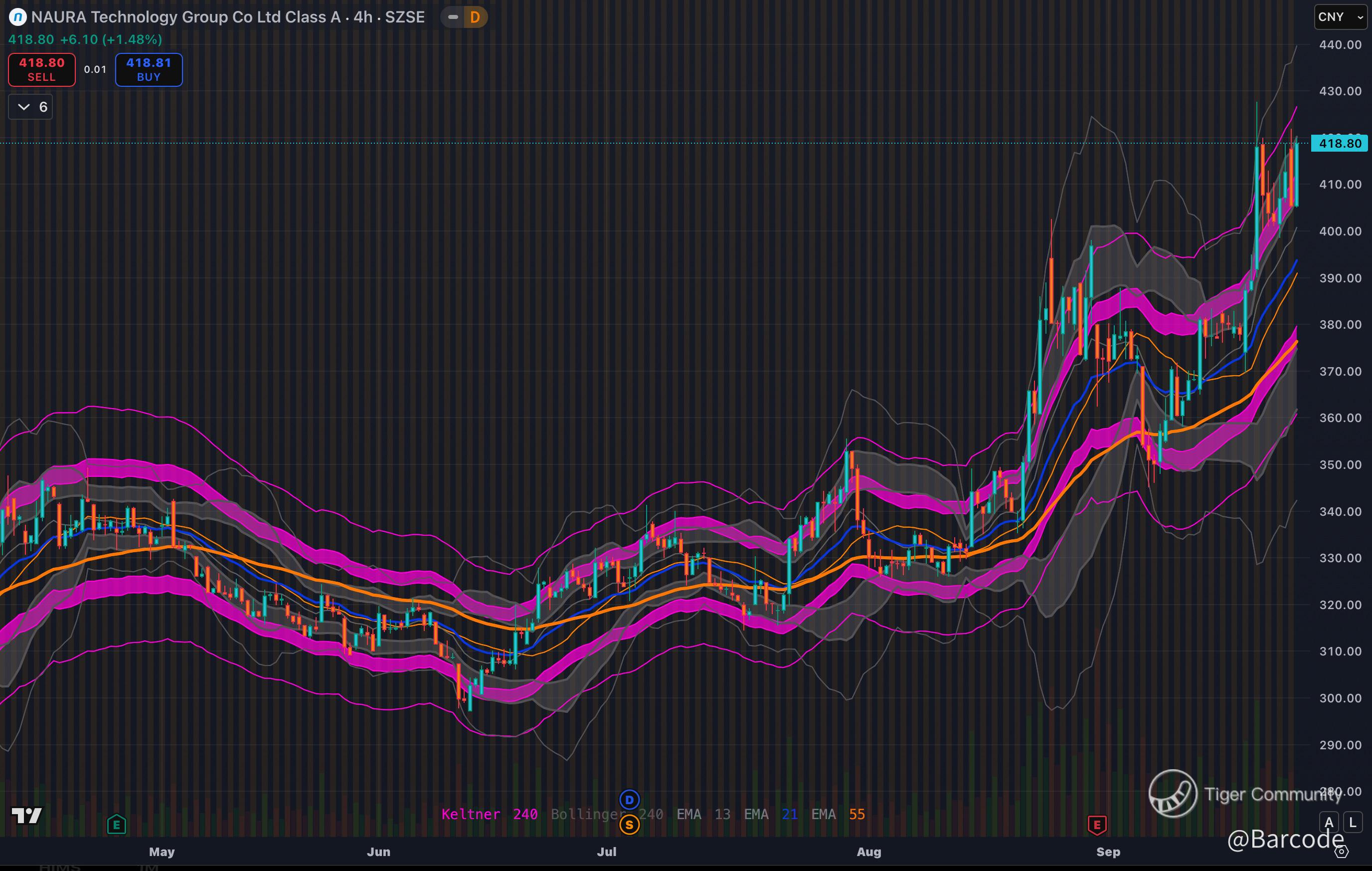 ⚙️ Where does NAURA come in? As China’s premier semiconductor equipment supplier, NAURA is the backbone that enables this vision. The chart shows NAURA breaking above ¥418 with strong volume, riding upper Keltner and Bollinger channels. This is textbook strength: higher lows since July, accelerating trend since September, and volatility expansion confirming accumulation.