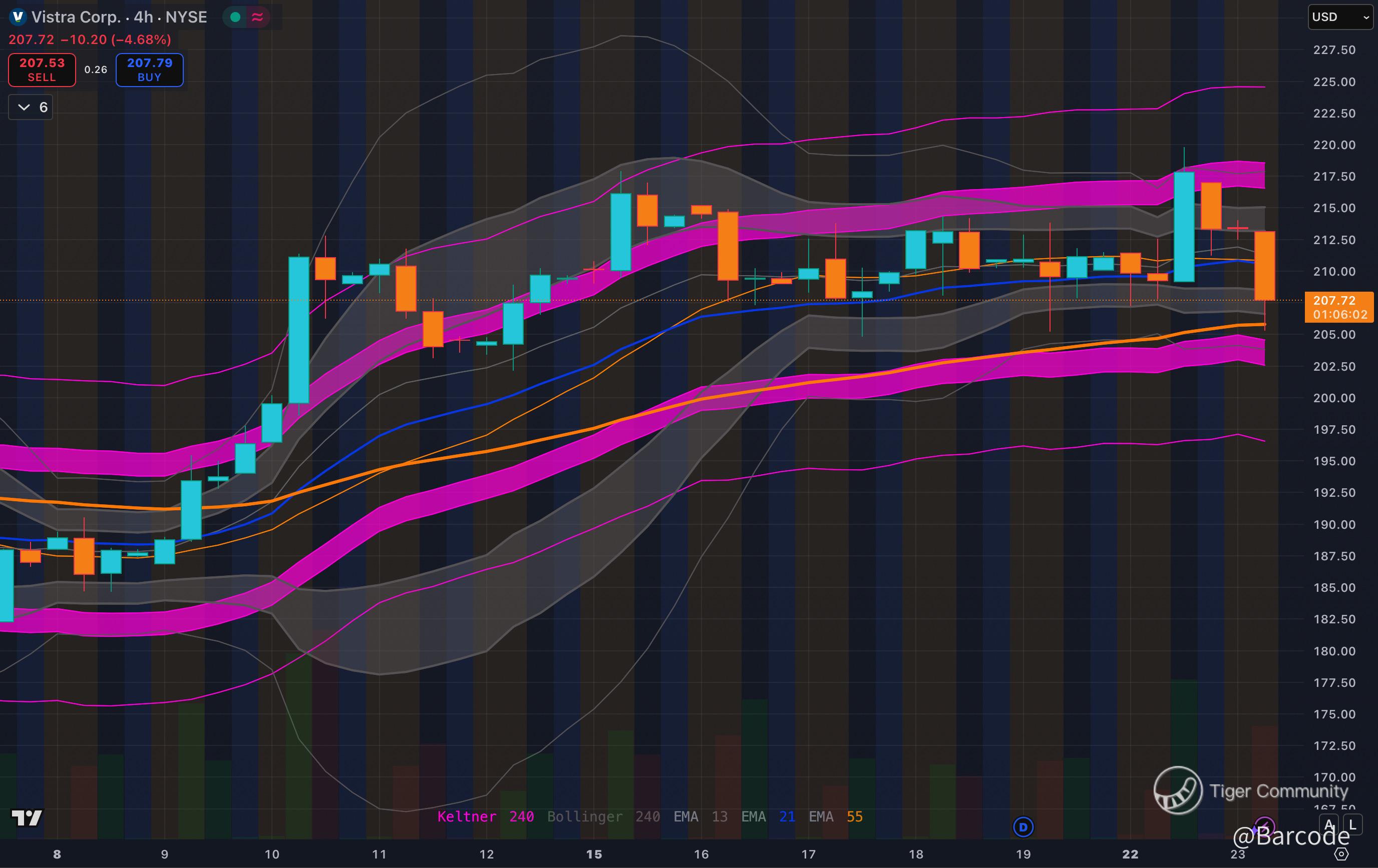 Today’s -6% drop to $207.72 landed right into Keltner and EMA support zones on the 4H chart. Price is consolidating between $205–210 after a parabolic run-up. A sustained break below $205 risks momentum fading back toward $195, while reclaiming $215+ would reopen the door to $220 and the Jefferies $230 PT.