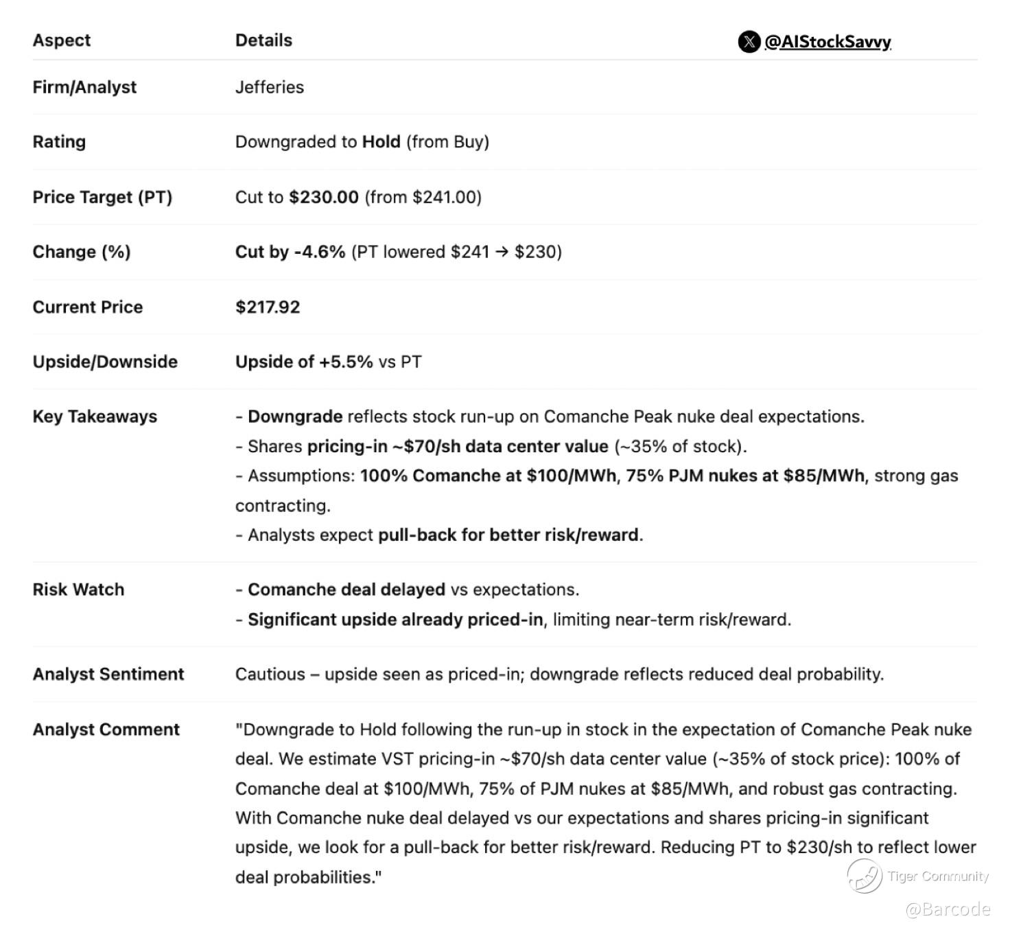 Jefferies downgraded $VST to Hold from Buy and trimmed their PT to $230 from $241. The downgrade was framed around the Comanche Peak nuclear deal being delayed, plus analysts flagging that ~$70/share of data center value (35% of the stock) is already priced in. They see better entry points after a pullback, with the stock essentially trading in line with their assumptions of Comanche at $100/MWh and PJM nukes at $85/MWh.