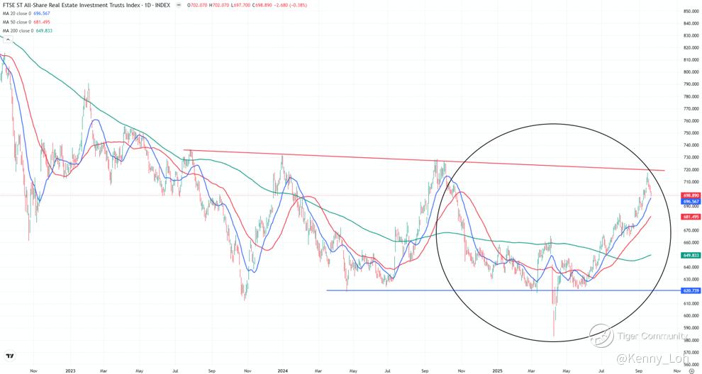 The Singapore REIT sector has broken out of its previous lower trading range and is now consolidating between ~695 and 720, which is notably higher than the earlier ranges around the mid-600s. This reflects improving sentiment, supported by easing bond yields.