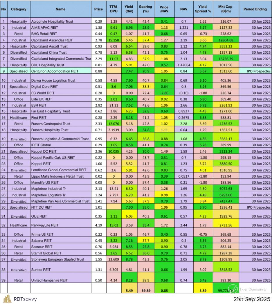 Singapore REITs Sep2025 Update of 39 REITs