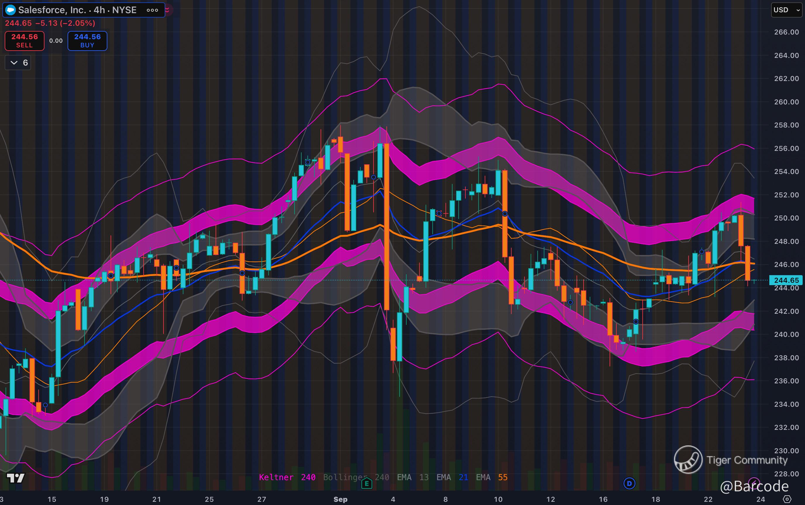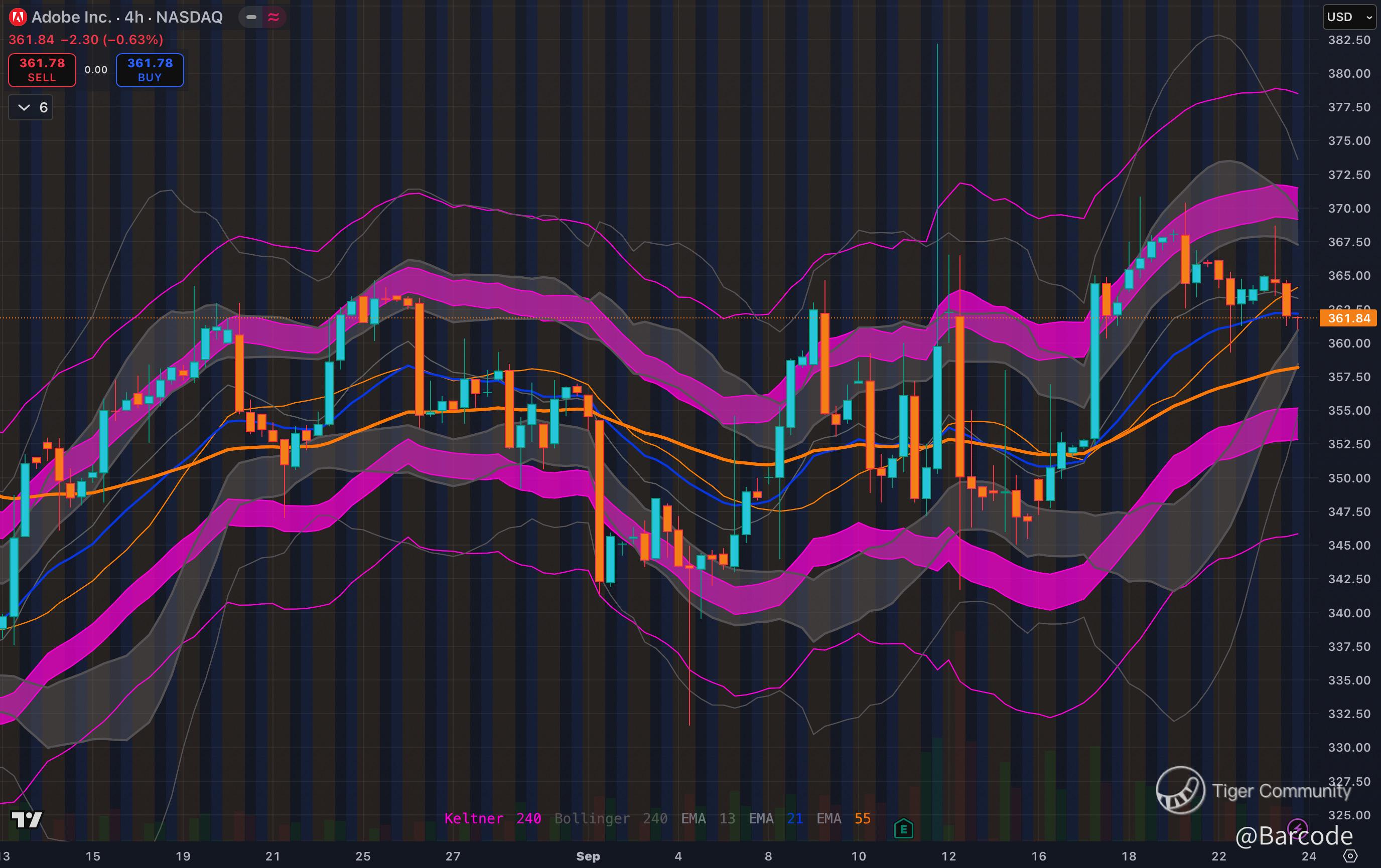 Technicals: ADBE trades at $361 inside Keltner and Bollinger compression. A breakout above $370 targets $382; support rests at $350.