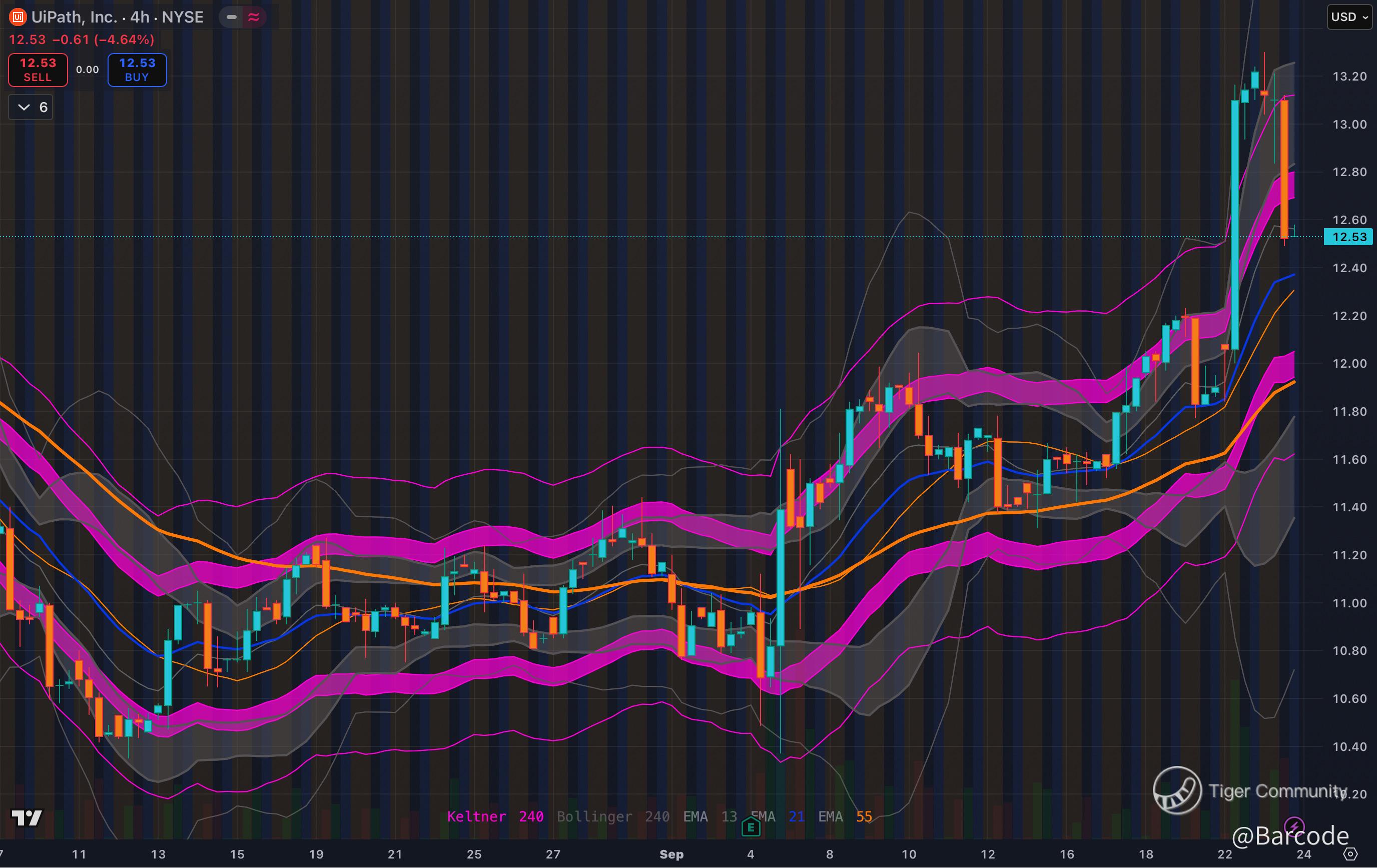 Technicals: PATH trades at $12.53 after testing $13.20. Keltner expansion with higher lows indicates potential momentum reload above $12.