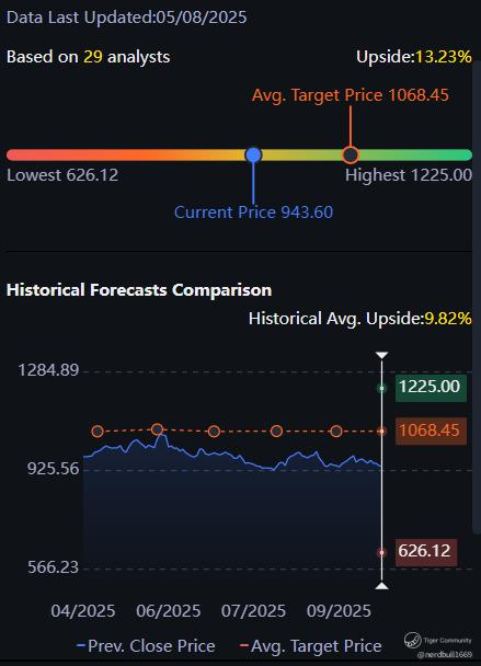 Based on 29 analysts from Tiger Brokers offering 12 month price targets for Costco in the last 3 months. The average price target is $1,068.45 with a high forecast of $1,225.00 and a low forecast of $626.12. The average price target represents a 13.23% change from the last price of $943.60.