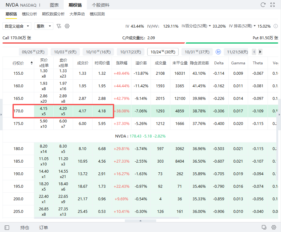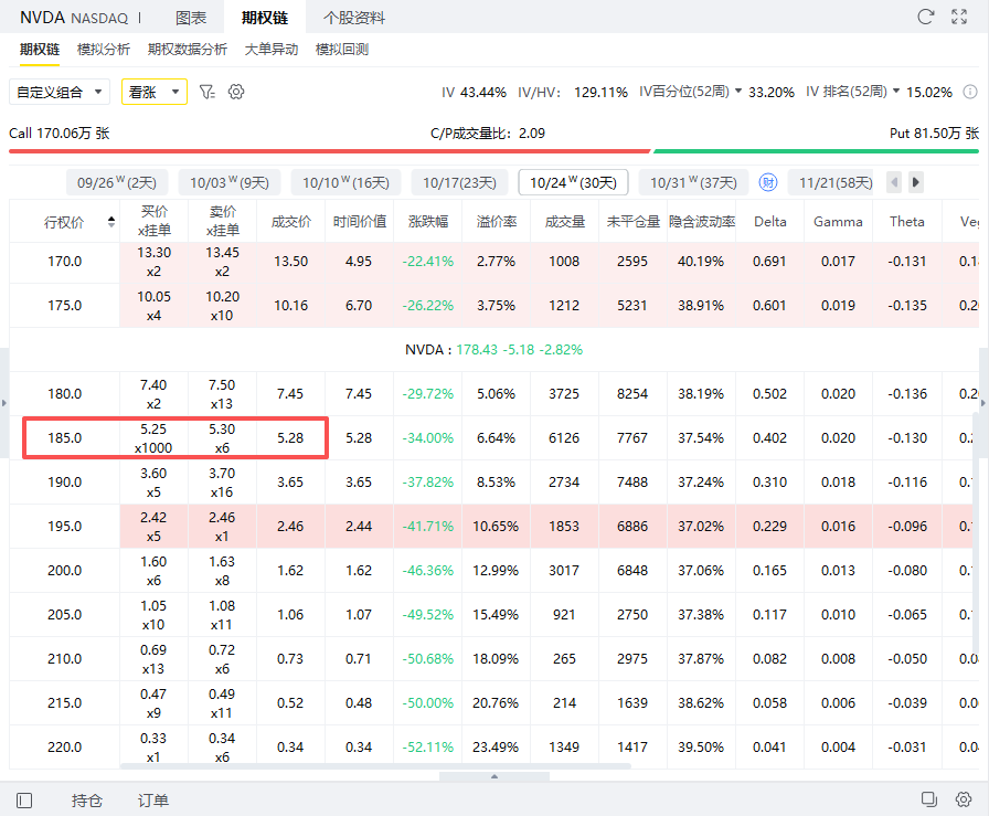 In the first step, investors can sell a call option with an exercise price of $185 and an expiration date of October 24 at a price of $528, earning $528.