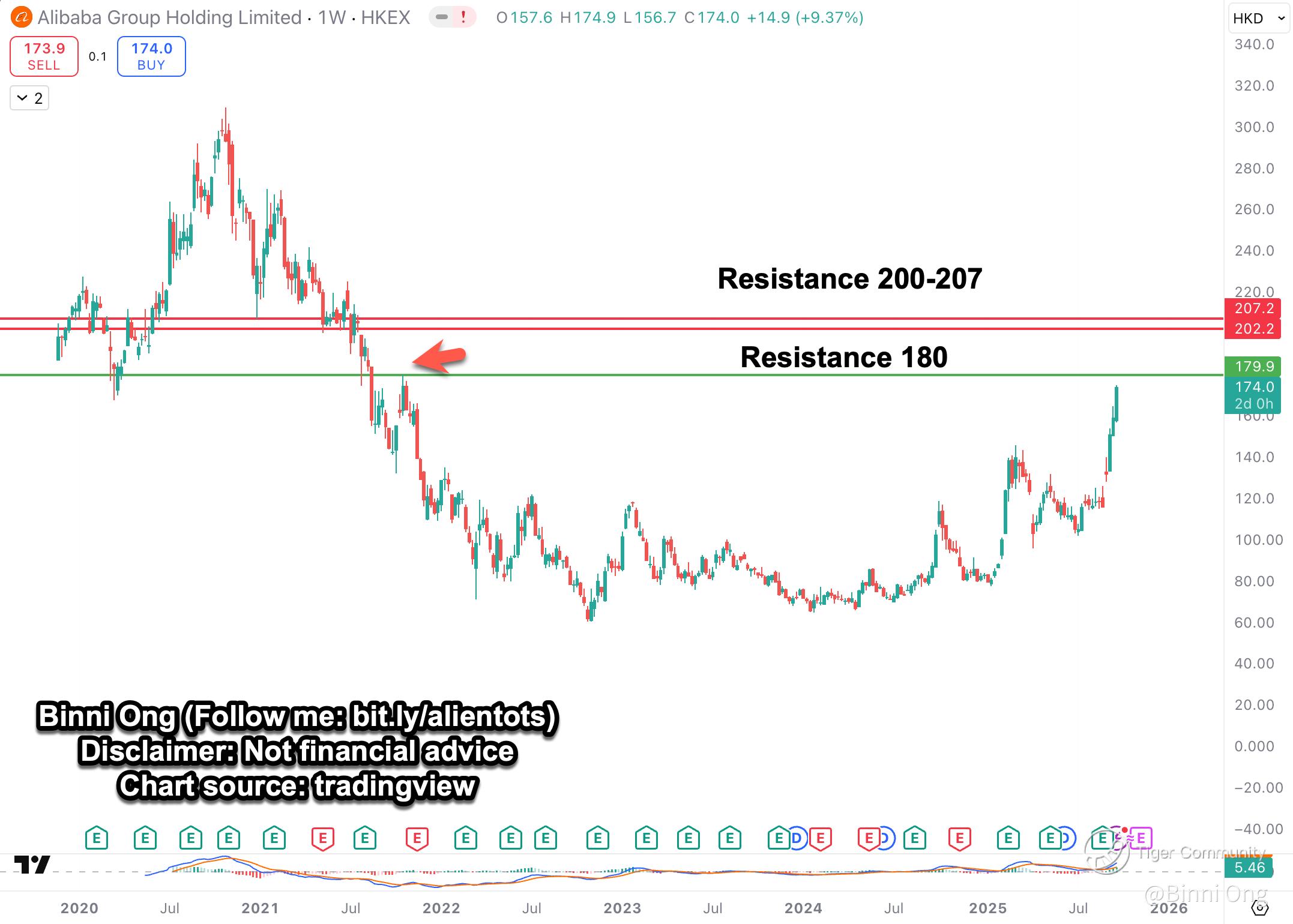 If Alibaba can cross and sustain above HK$180, it could face fewer obstacles until HK$200+.