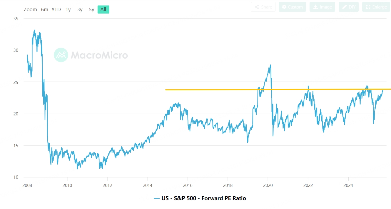 $S&P 500(.SPX)$ is indeed expensive now. Its NTM (Next Twelve Months) P/E has now reached 23.64, approaching historical highs. It’s close to last December’s level and not far from the 27x mark in 2020. With valuations at such high levels, any small disturbance could trigger a downturn.