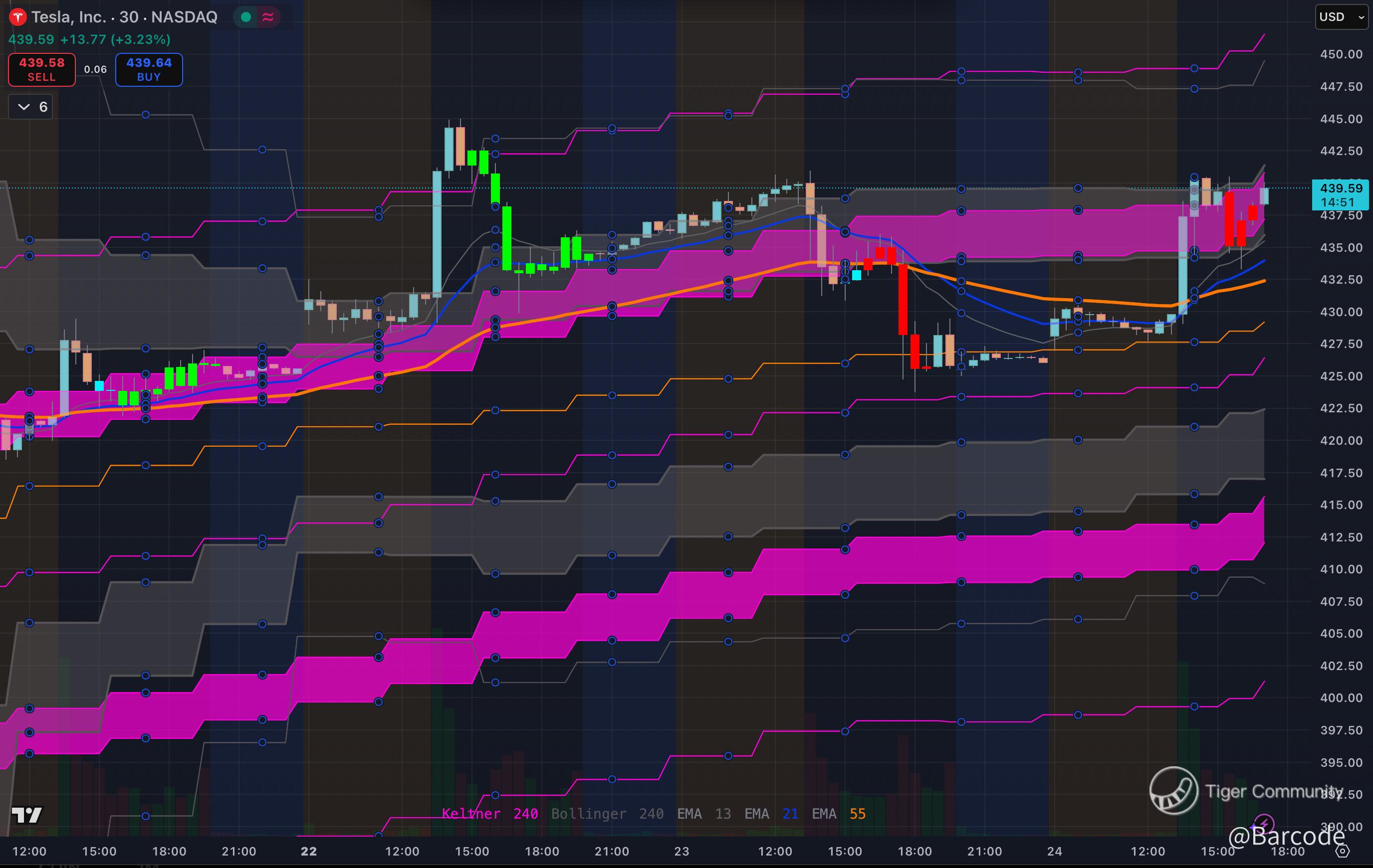 On the 4H, Tesla continues to respect EMA stacks and ride the upper Keltner/Bollinger channels, showing trend integrity. On the 30m, it defended 427, reclaimed the pink cloud, and is now re-basing around 439.59. That intraday defence reinforces the higher-timeframe bullish case.