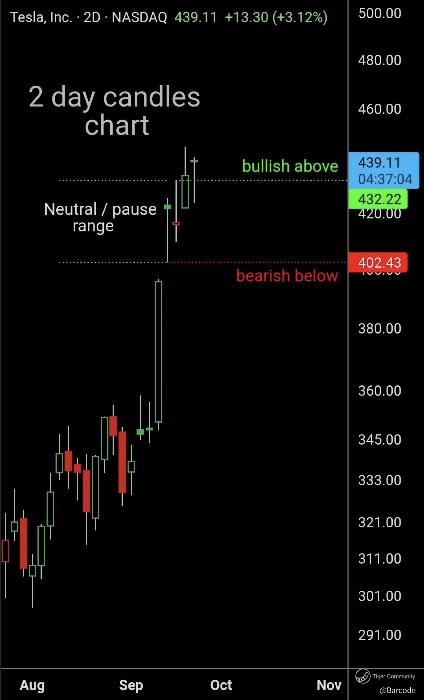 🟠 Breakout confirmed above 439.11, Tesla has cleanly flipped the neutral/pause zone into support.