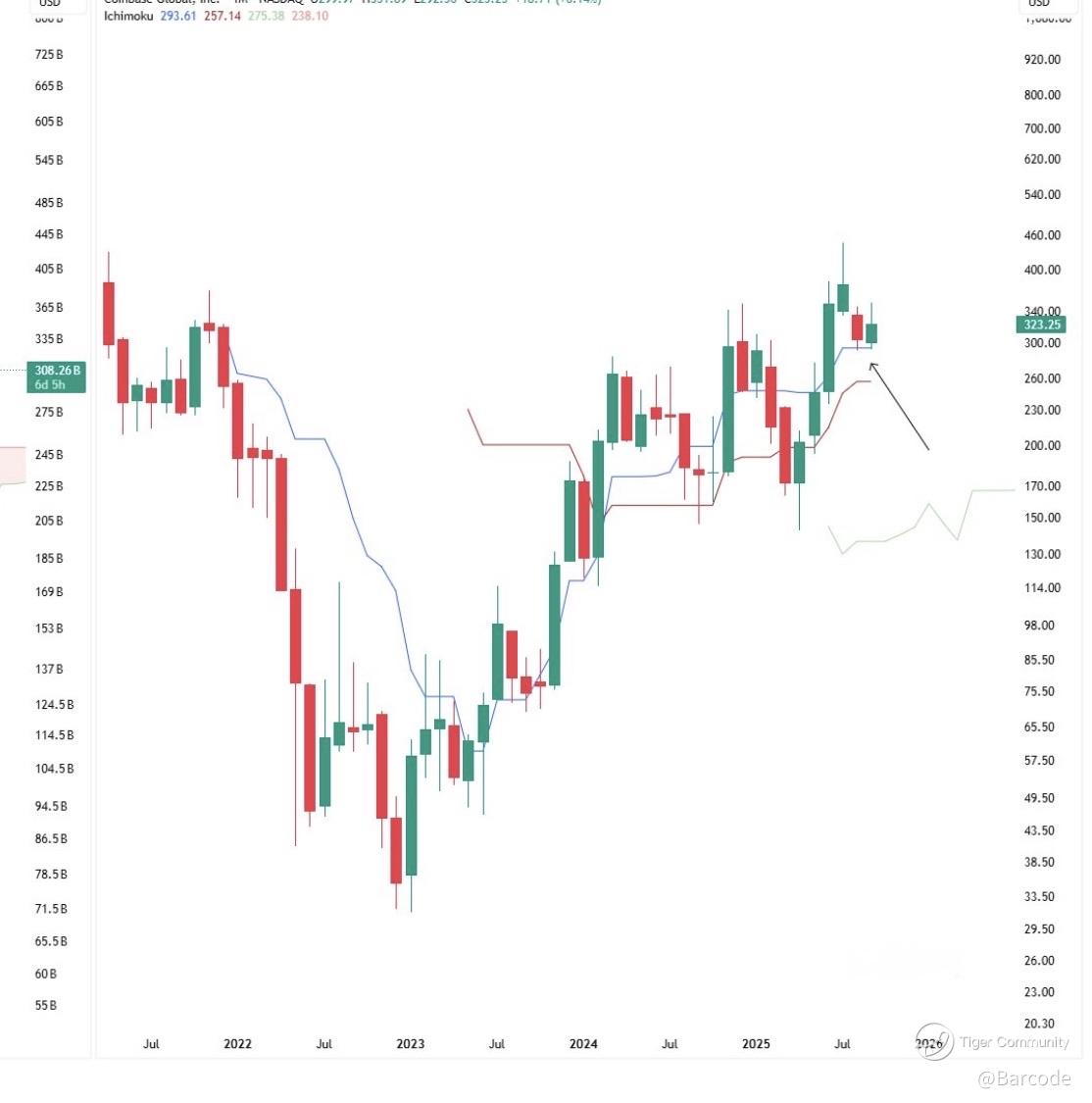 Iβm convinced $COIN is shaping up as one of the most asymmetric setups in the crypto-equity space right now. The monthly Ichimoku Tenkan has been reclaimed as support, not just for Coinbase but across the broader crypto market ($OTHERS). Historically, this level acts as the springboard before major expansions.