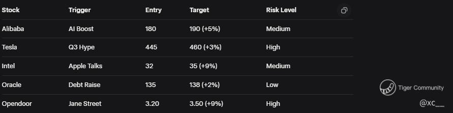 Trading Opportunities? Go long Alibaba above $180 for a 5-7% swing to $190, Tesla at $445 targeting $460 on delivery beats, and Intel at $32 for a $35 pop if Apple ink flows. Oracle’s dip to $135 is a scalp play—aim for $138 with a tight stop at $133. Opendoor’s breakout to $3.50 is a high-conviction add on volume, betting on housing thaw. Plan’s locked: 50% entry, 5% trail stops, scale out at 8% gains. Volatility’s your friend—ride the sector rotation wave.