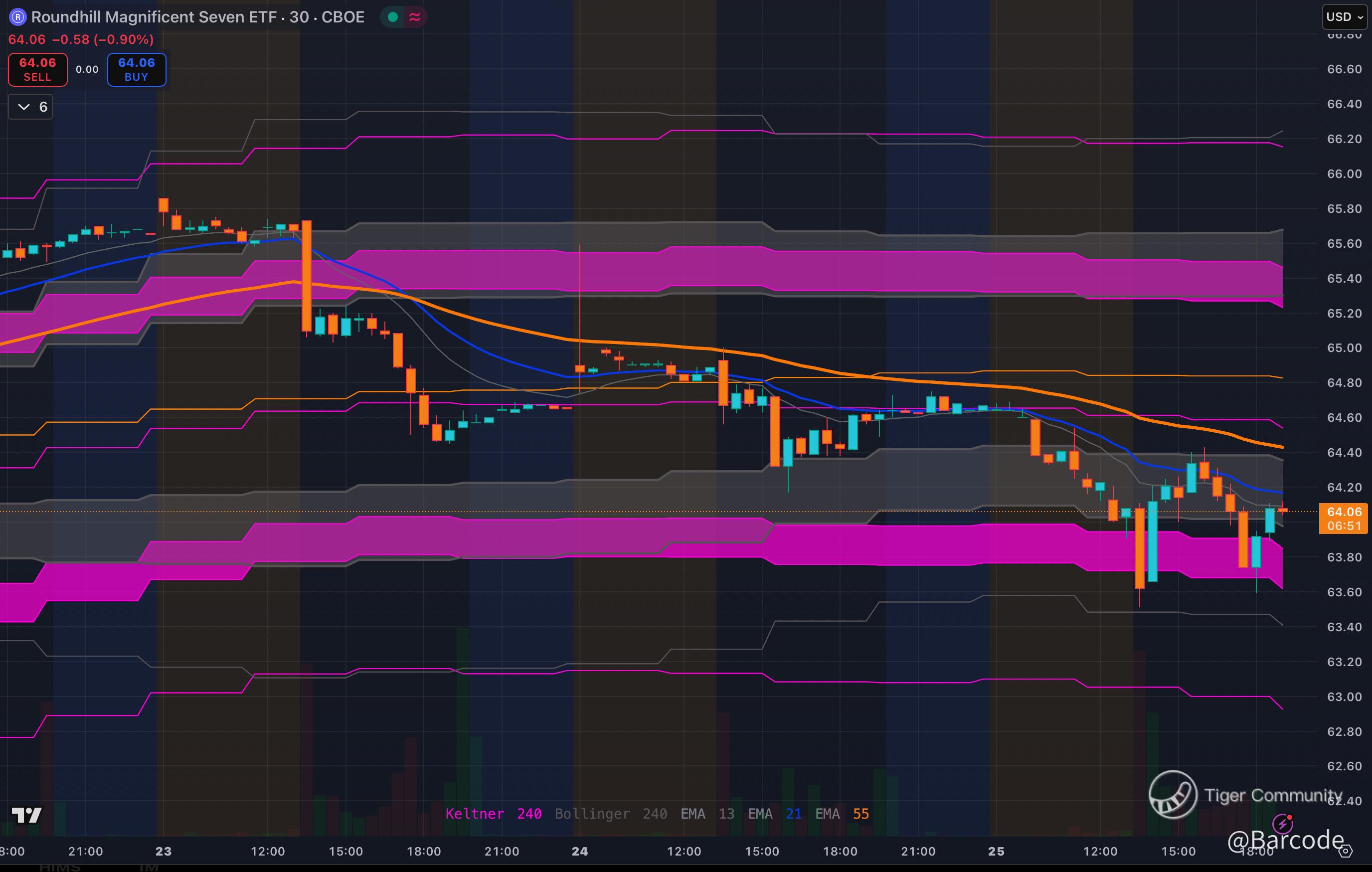 On the technical side, the Roundhill Magnificent Seven ETF (MAGS) charts are flashing fatigue. The 30-minute chart shows sharp sell-offs into Keltner compression zones with weak bounces capped by declining EMAs. The 4-hour chart confirms distribution: after weeks of clean trend channels, price is now slipping below the mid-Keltner and leaning on EMA-55, threatening a break of the August–September momentum base around $63.50. If that shelf fails, liquidity vacuum pockets open quickly toward $62.