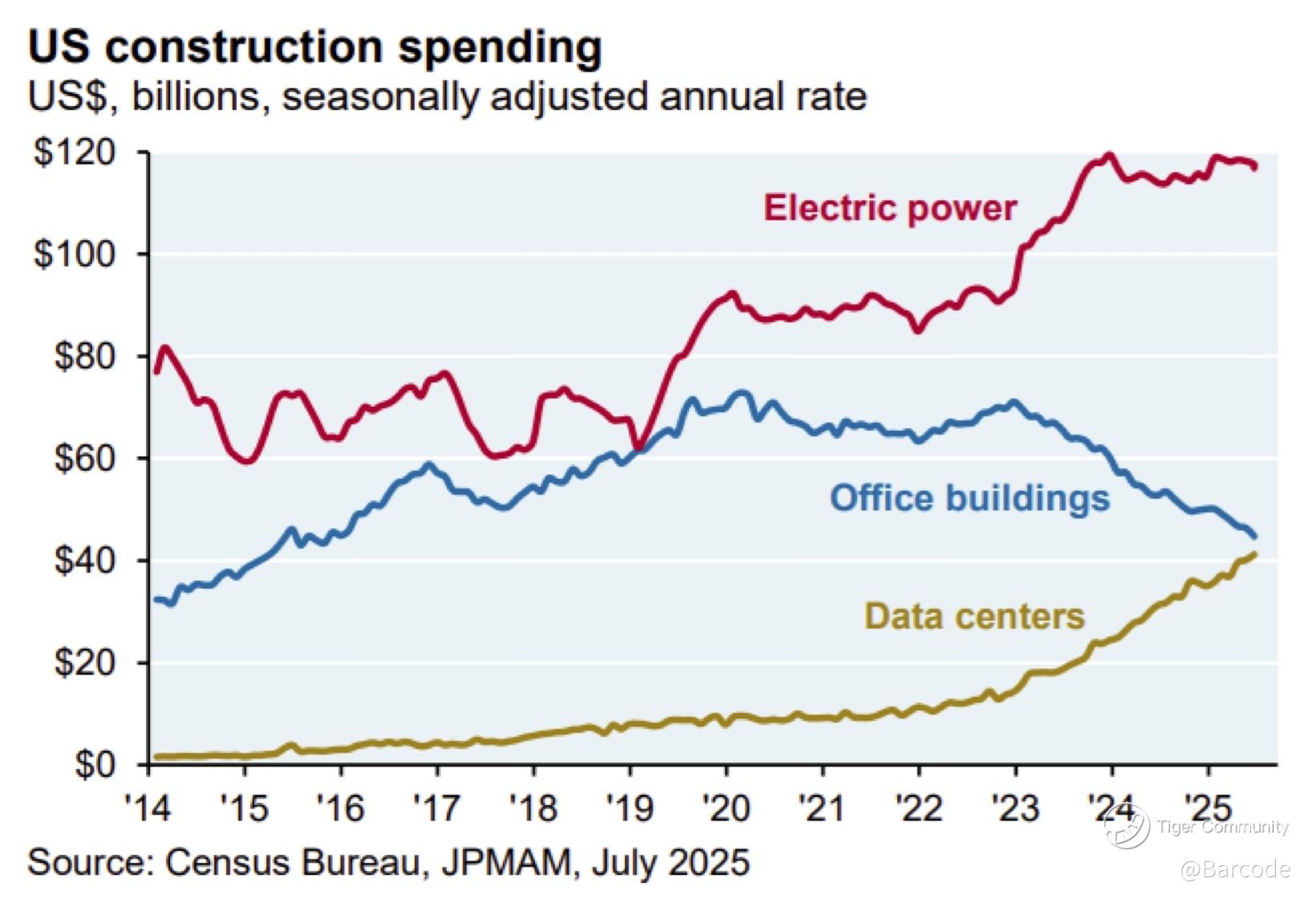 AI-linked equities are the epicenter. Since ChatGPT’s launch in November 2022, they’ve accounted for 75% of S&P 500 returns, 80% of earnings growth, and 90% of capital spending growth. The construction spending chart says it all: data centers have eclipsed office construction for the first time ever, while electric power infrastructure has surged to record highs. Demand from hyperscalers isn’t just bending the construction cycle, it’s bending the entire grid. In the PJM region, 70% of last year’s electricity cost increases came directly from data centers.