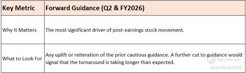 Since the expected headline numbers (Revenue and EPS) are already low, investor focus will be heavily skewed toward signs that the "Win Now" strategy is beginning to stabilize the business and provide confidence in the second half of the fiscal year (H2 2026).