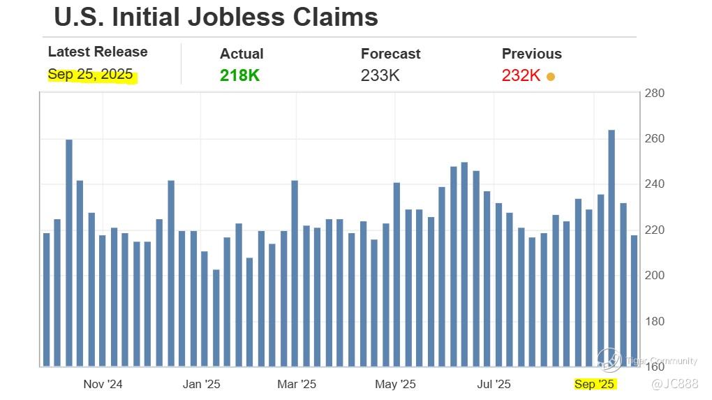 • For week ended 20 Sep 2025, US weekly jobless claims fell by 14,000 to 218,000 vs market estimates of 233,000 vs 13 Sep 2025’s claims of 232,000.