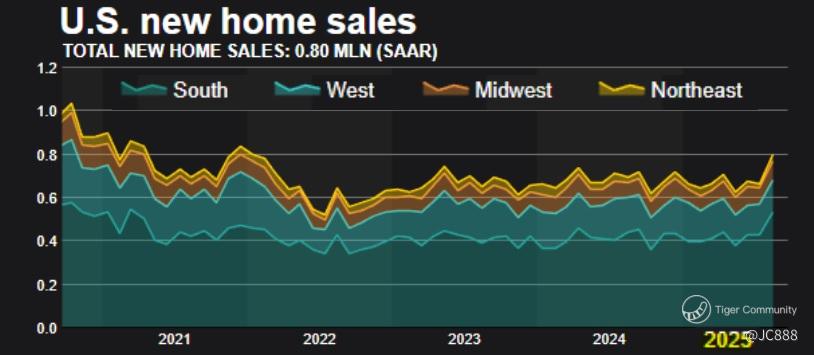 • Sales of new single-family homes in US for August 2025, surged by +20.5% to a seasonally adjusted annual rate of 800,000 units.