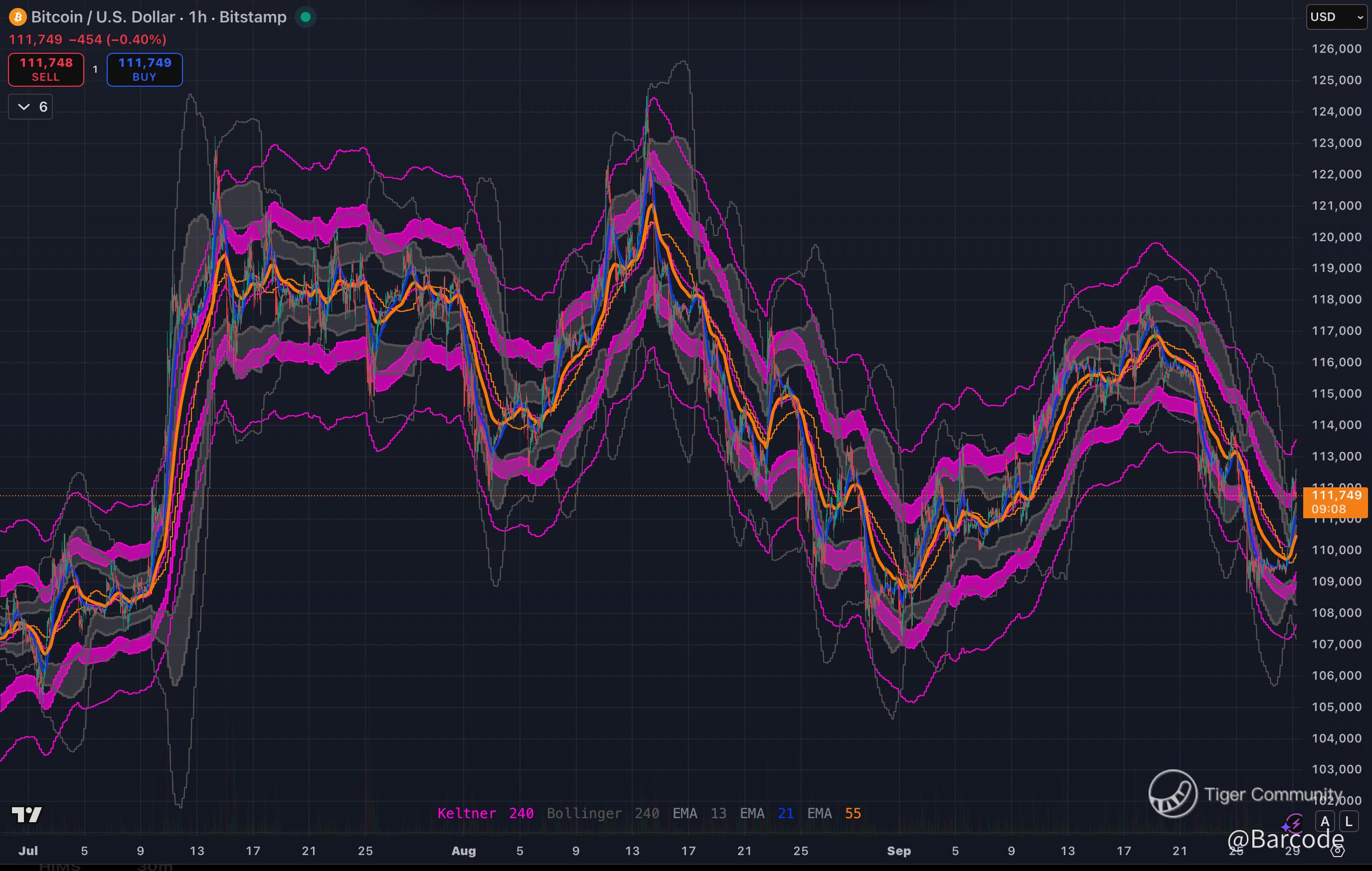 Textbook volatility expansion. We’re compressing inside rising EMAs with layered Bollinger + Keltner confluence. Historical rhythm shows these setups often expand into 5–7% moves before fading. Right now, the structure is intact and climbing.