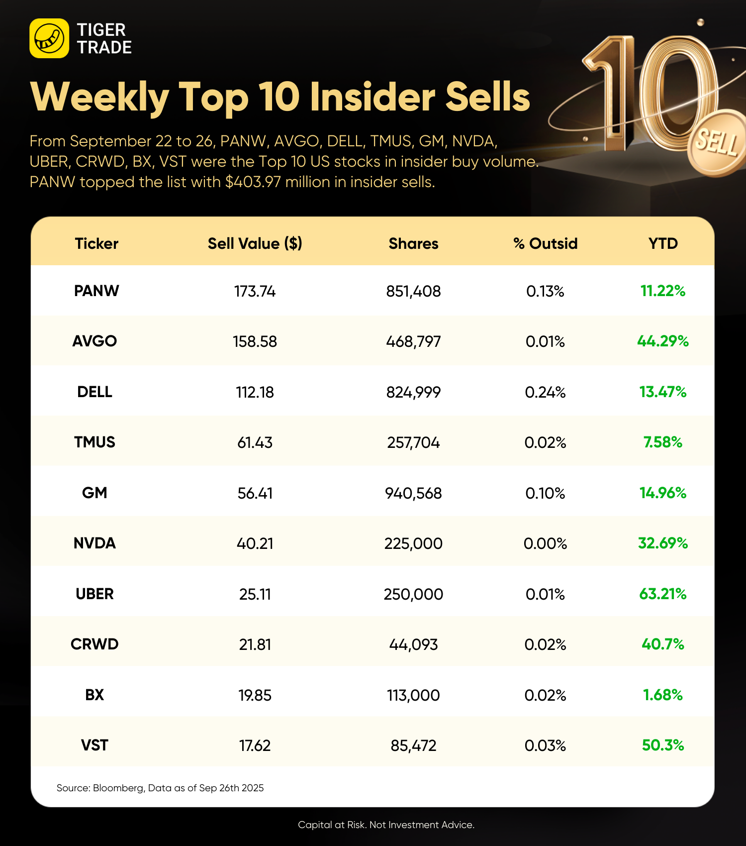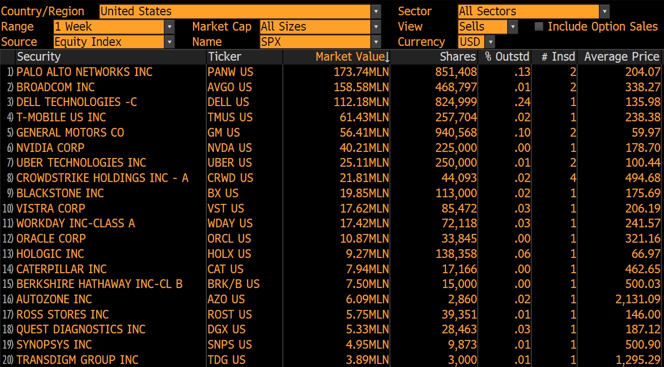 Firstly, the top 10 insider stock sales, ranked by amount, were $Palo Alto Networks(PANW)$ $Broadcom(AVGO)$ , $Dell Technologies Inc.(DELL)$ , $T-Mobile US(TMUS)$ , $General Motors(GM)$ , $NVIDIA(NVDA)$ , $Uber(UBER)$ , $CrowdStrike Holdings, Inc.(CRWD)$ , $Blackstone Group LP(BX)$ and $Vistra Energy Corp.(VST)$.