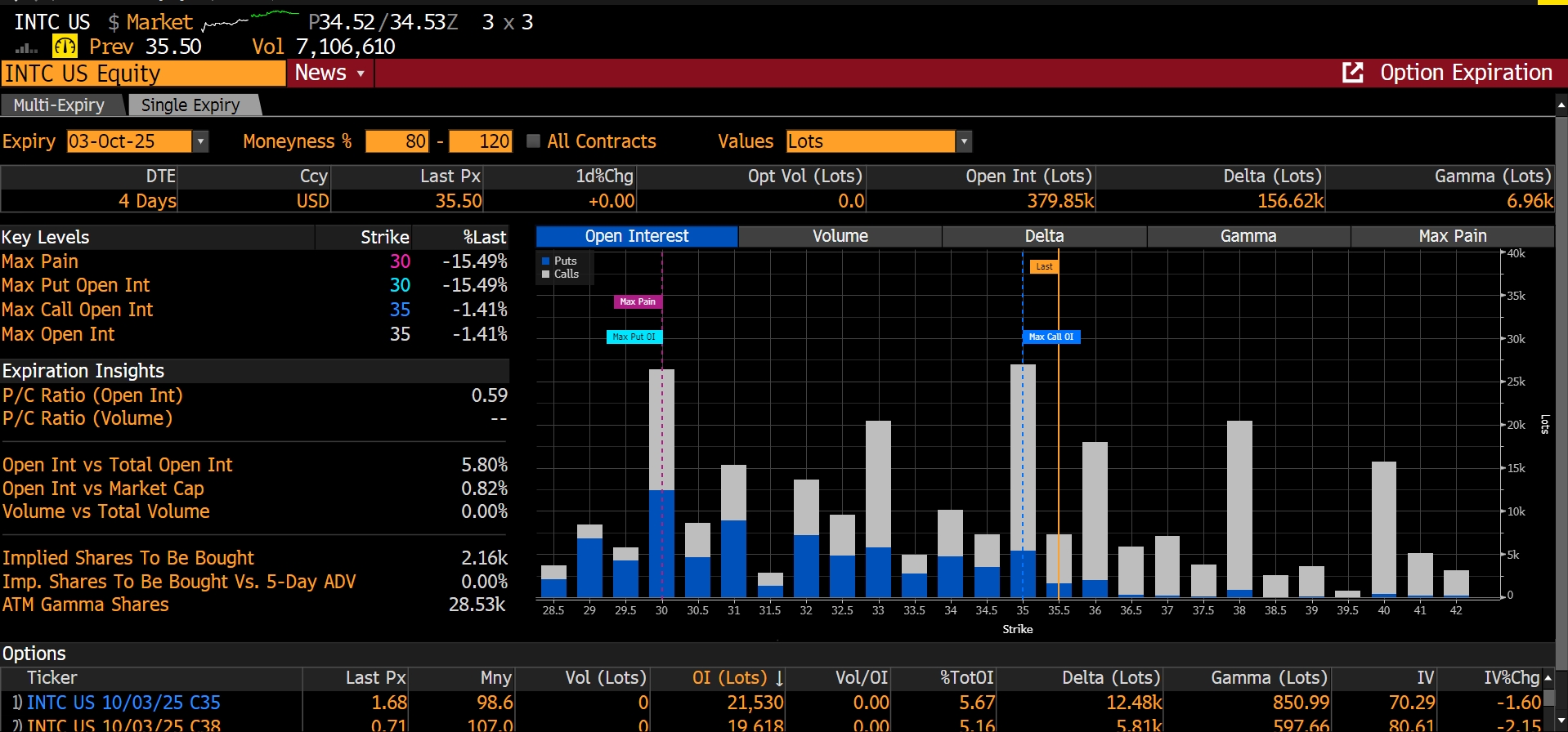 Based on Black–Scholes, this week’s expected closing range for Intel is $31–$40.