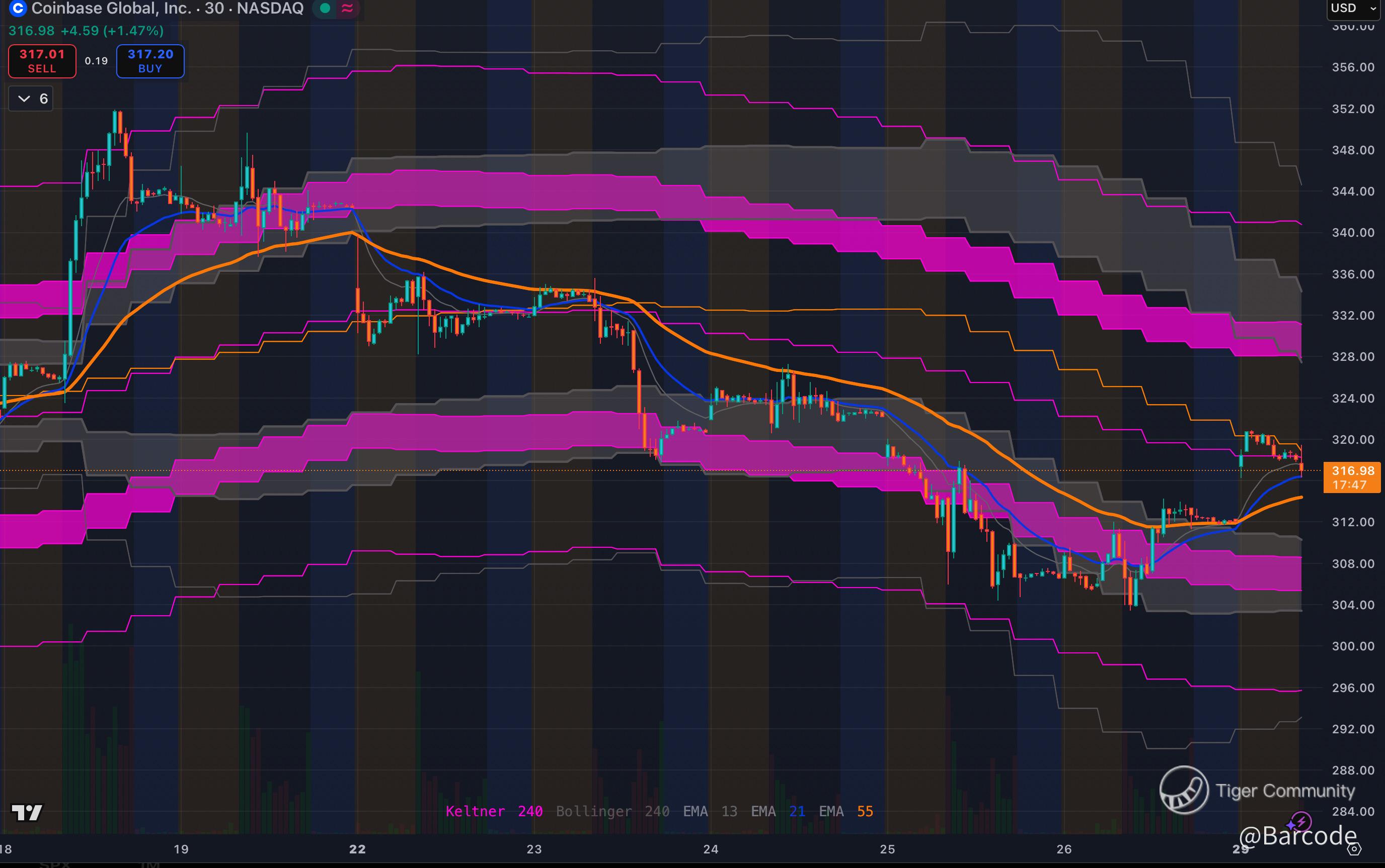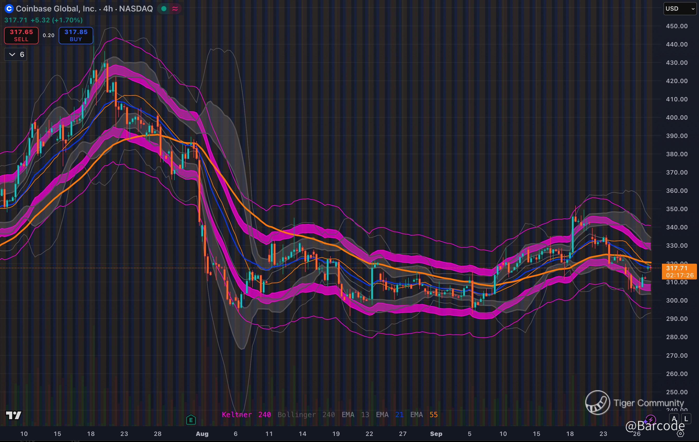 Price is holding above the short-term mid-vol zones and tracking a rising EMA structure. If $COIN clears π $328.60, the ignition level is met; likely triggering flows back to π΄ $344.10, then π’ $385.