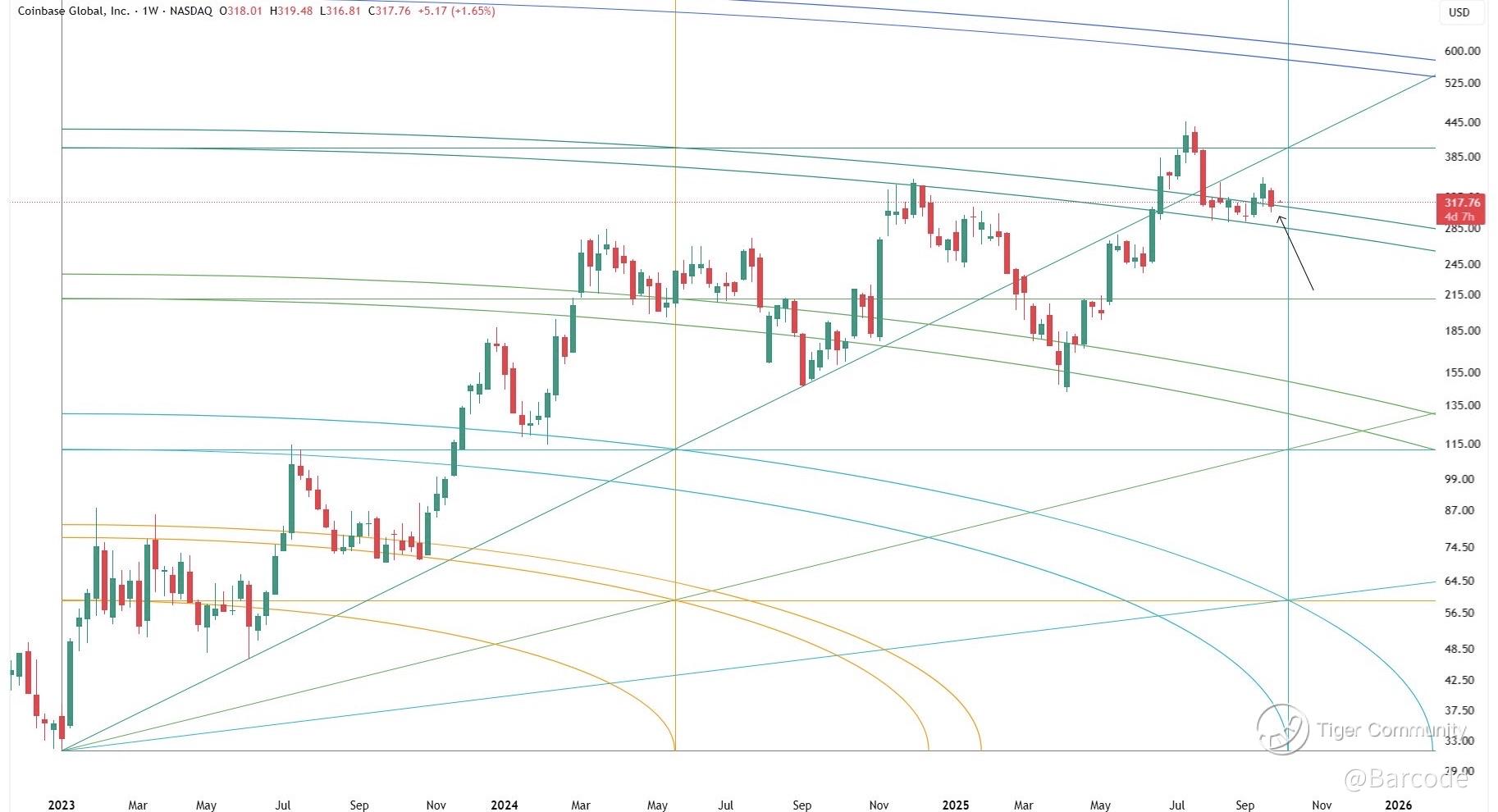 Weekly structure just held the line. $COIN defended the ascending Gann arc from the 2023β2024 confluence and rejected a full breakdown into the lower arc zone near π΅ $285. This wasnβt just a bounce, it was a macro validation.