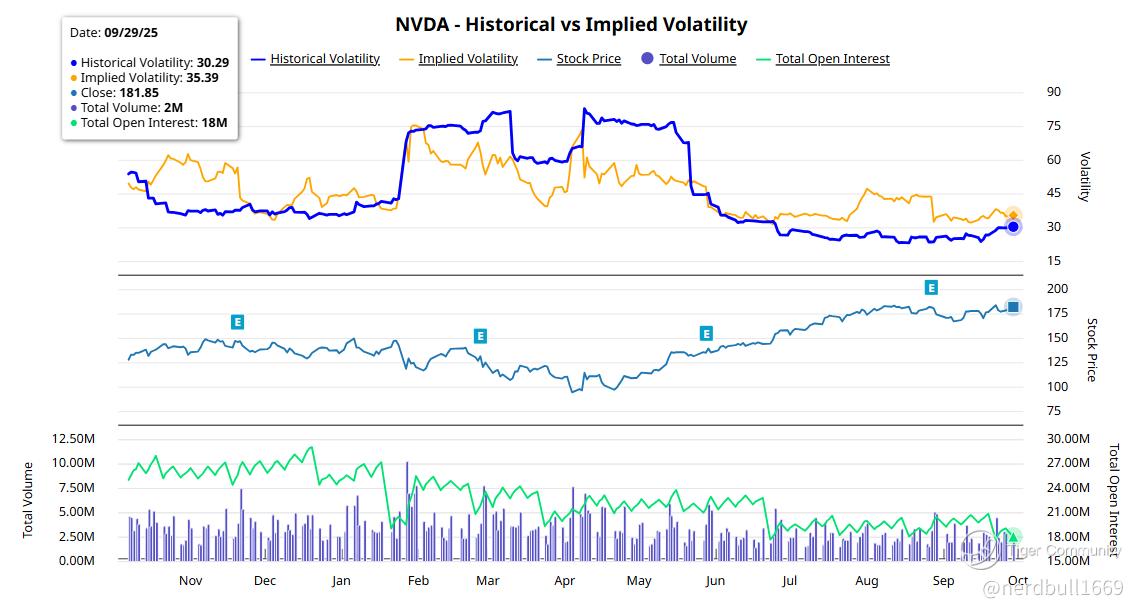 As of late September 2025, NVDA's implied volatility is around 33.7% to 34.5%, while its historical volatility is significantly higher, with the 20-day historical volatility at about 34.9% and the 252-day historical volatility at approximately 45.5%. This means the options market is currently predicting future volatility will be lower than the recent realized volatility, as current implied volatility is below both the 20-day and the much longer-term 252-day historical volatility.