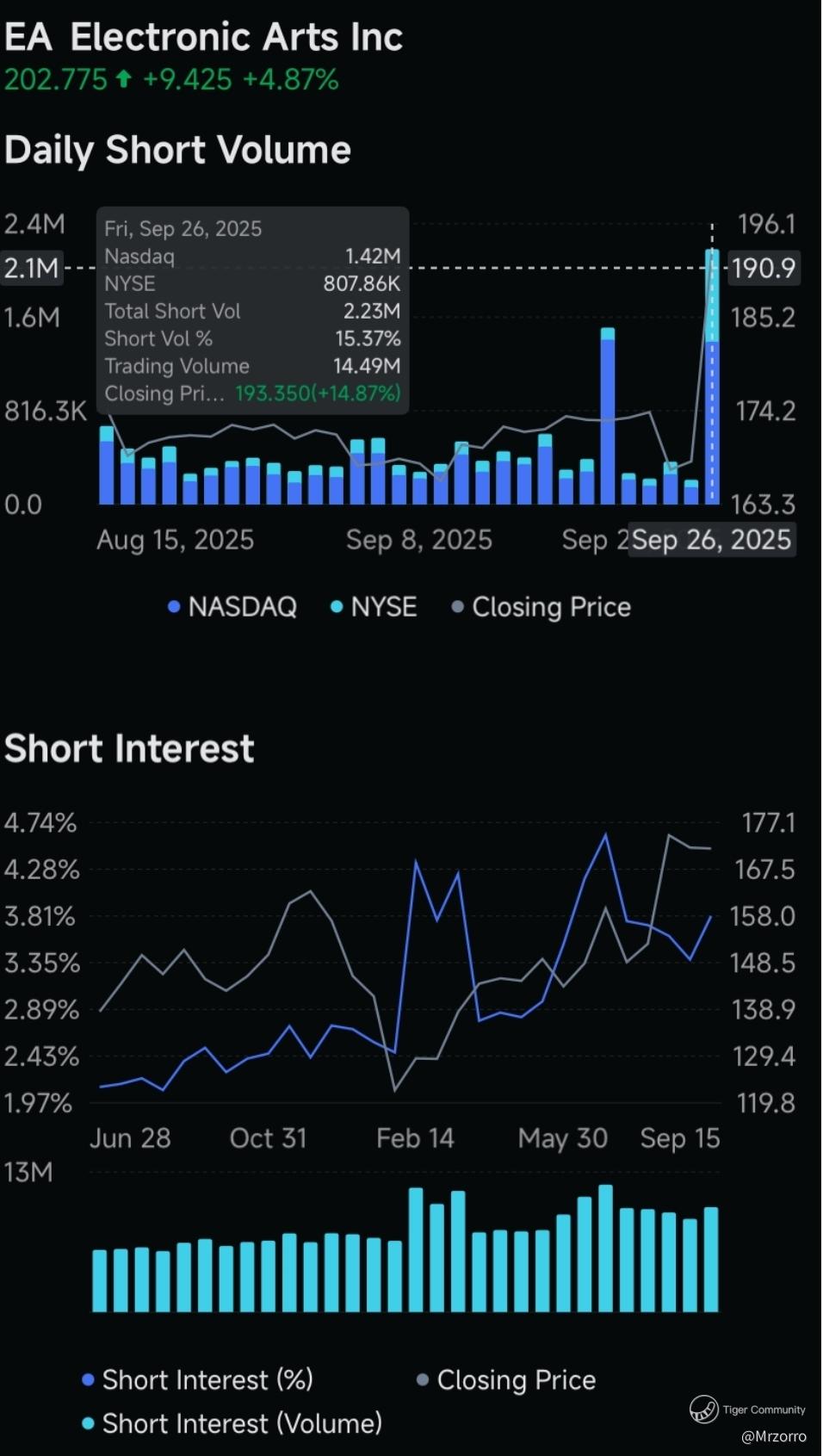 Electronic Arts saw its short volume climb to 2.23 million shares on Friday, from just 214,060 shares a day earlier, as the stock climbed 15% amid reports that the video-game company was being taken private by a group of investors.