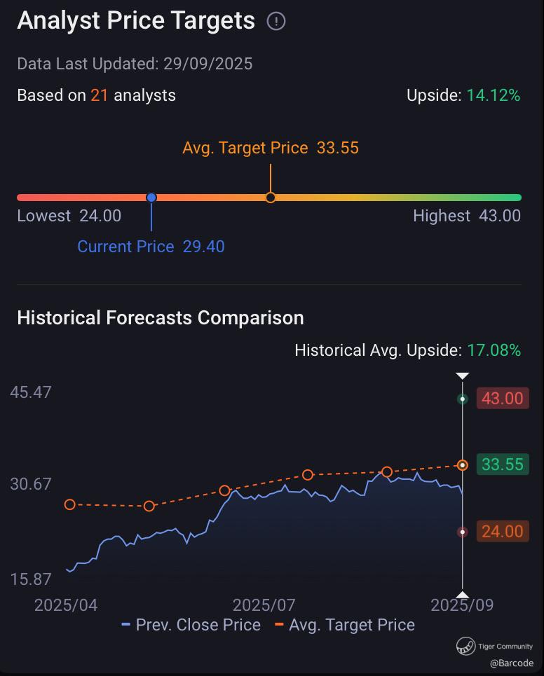 Average price target $33.55 implies 14% upside with highs at $43. Historical average upside sits at 17.08%. JPMorgan raised PT to $42, Goldman to $37. Analyst ratings: 32% strong buy, 46% buy, 21% hold. Citi’s James Hardiman: “a company that’s gaining share inside of a segment that’s gaining share.”