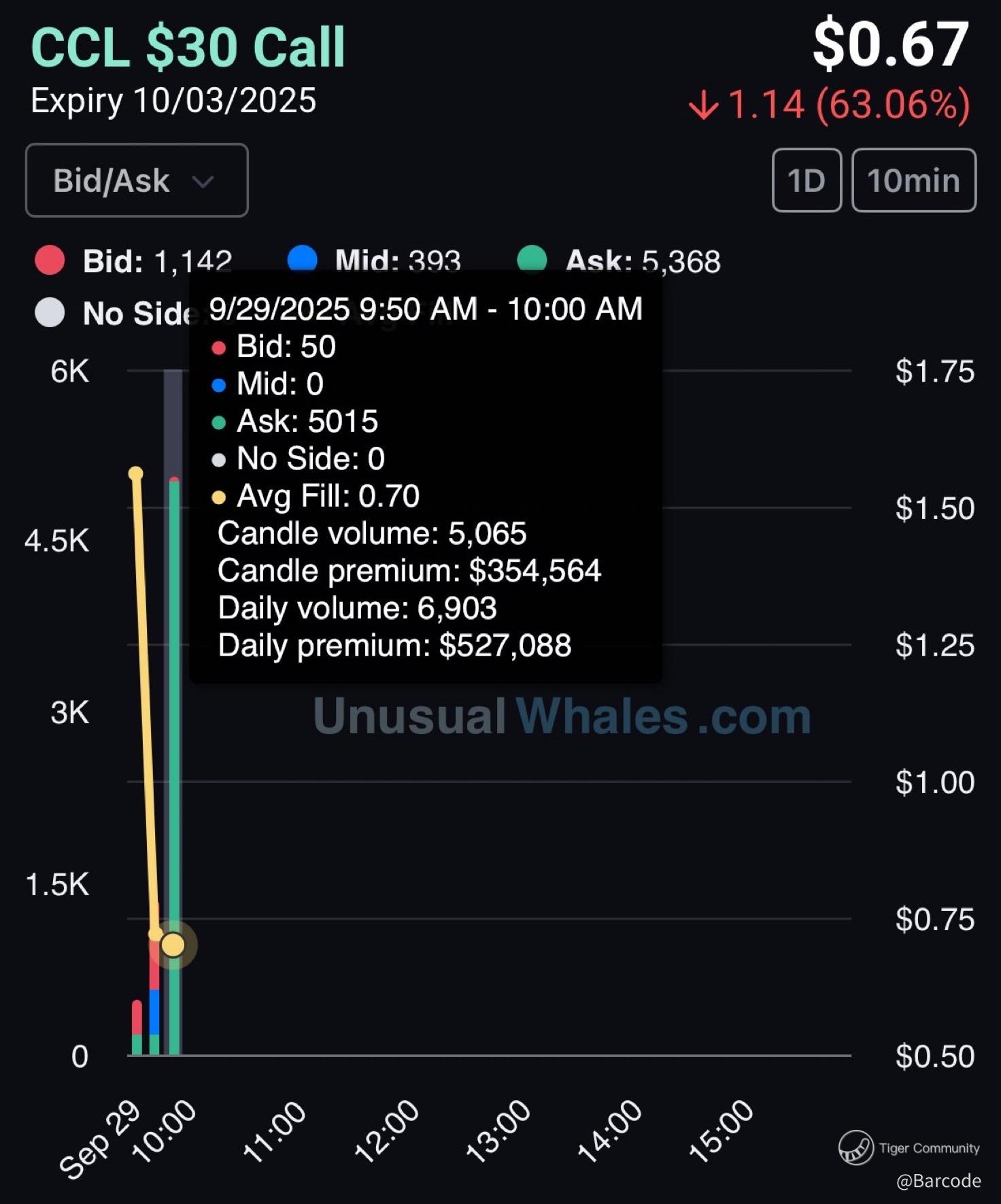 $30 calls expiring 10/03 collapsed 63% to $0.67 with bid 1,142 and ask 5,368. Candle volume 5,065 contracts with $354,564 premium; daily volume 6,903 contracts with $527,088 premium. Short-term speculators got flushed, creating a potential contrarian setup if fundamentals reassert.