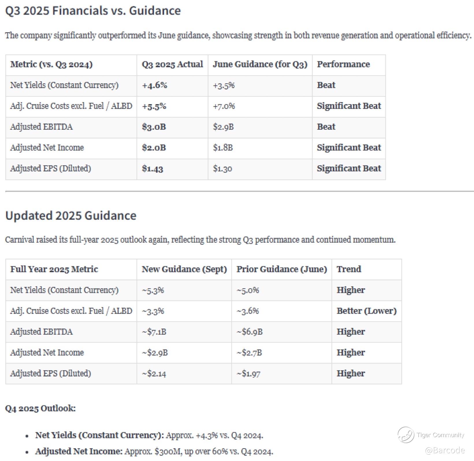 Carnival raised full-year metrics again: net yields ~5.3%, adjusted EBITDA ~$7.1B, adjusted net income ~$2.9B, adjusted EPS ~$2.14 versus prior $1.97. Q4 outlook flags net yields +4.3% vs Q4 2024 and adjusted net income of approximately $300M, up over 60% YoY; a powerful setup for the holiday booking season.