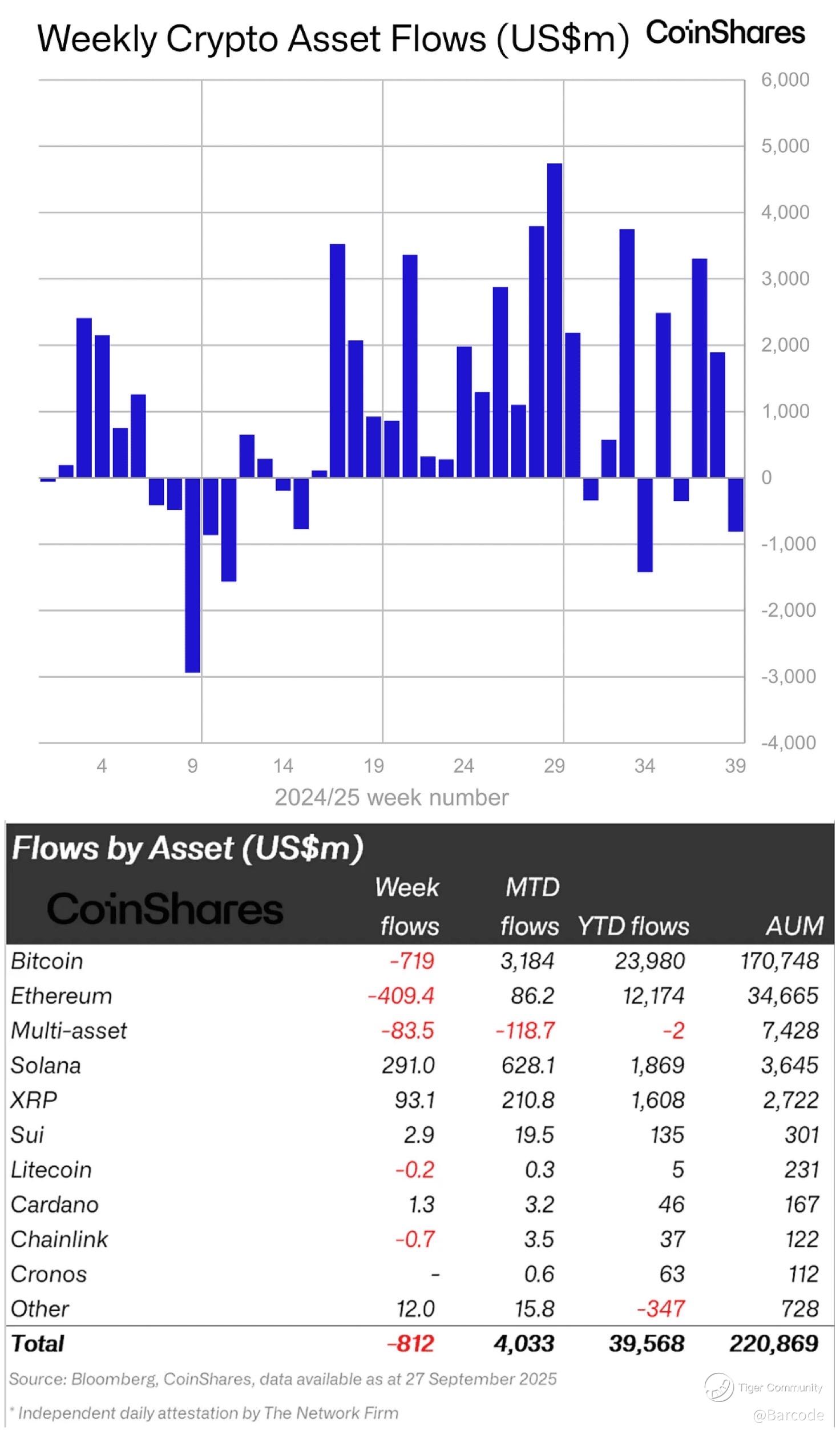 Digital asset funds just saw US$812m in outflows, the heaviest weekly bleed since mid-year. Bitcoin bled -US$719m, Ethereum shed -US$409m, yet Solana pulled in +US$291m and XRP added +US$93m. Institutions clearly rotated away from the majors into high-beta alt L1s. Year-to-date inflows remain US$39.6bn, near last year’s record, so this isn’t a full exit… it’s smart money repositioning.